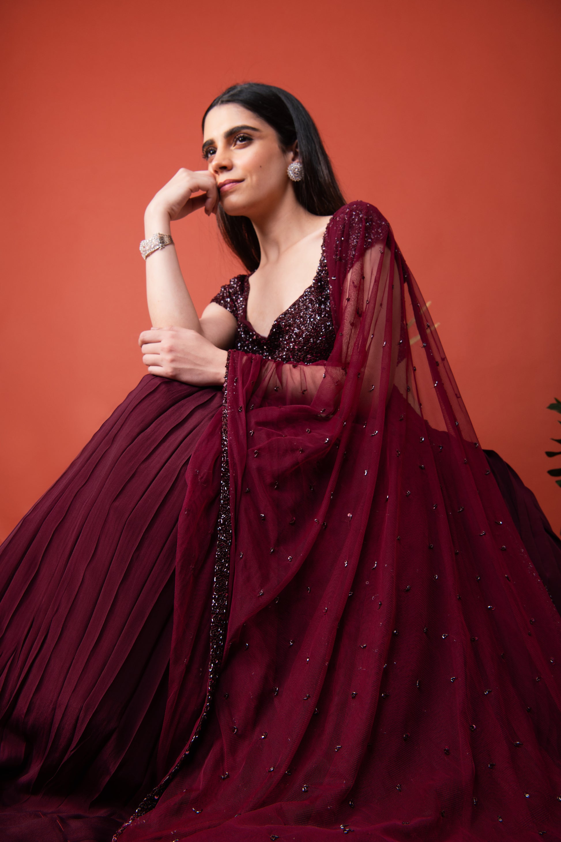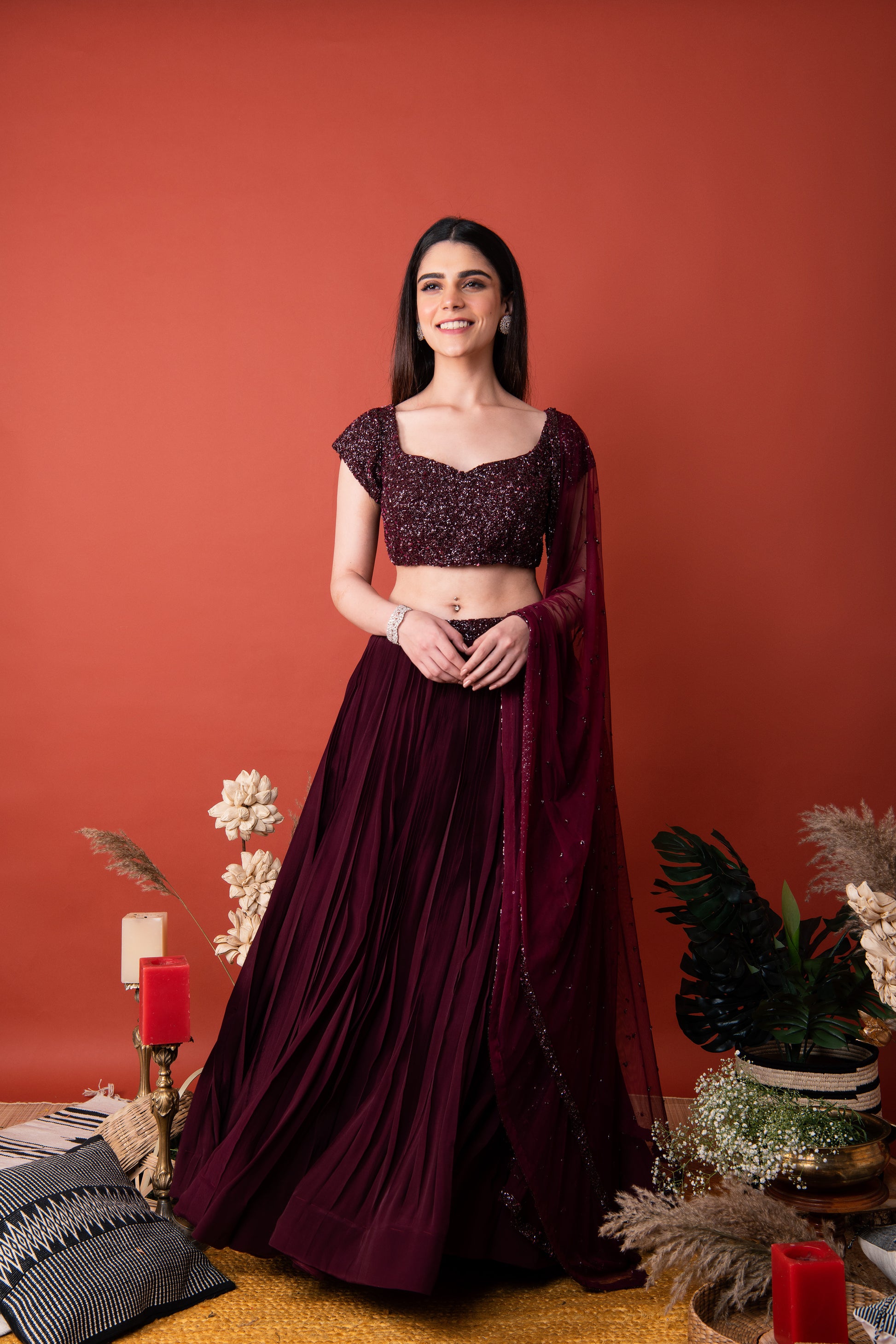 Embellished blouse and dupatta with pleated lehenga.