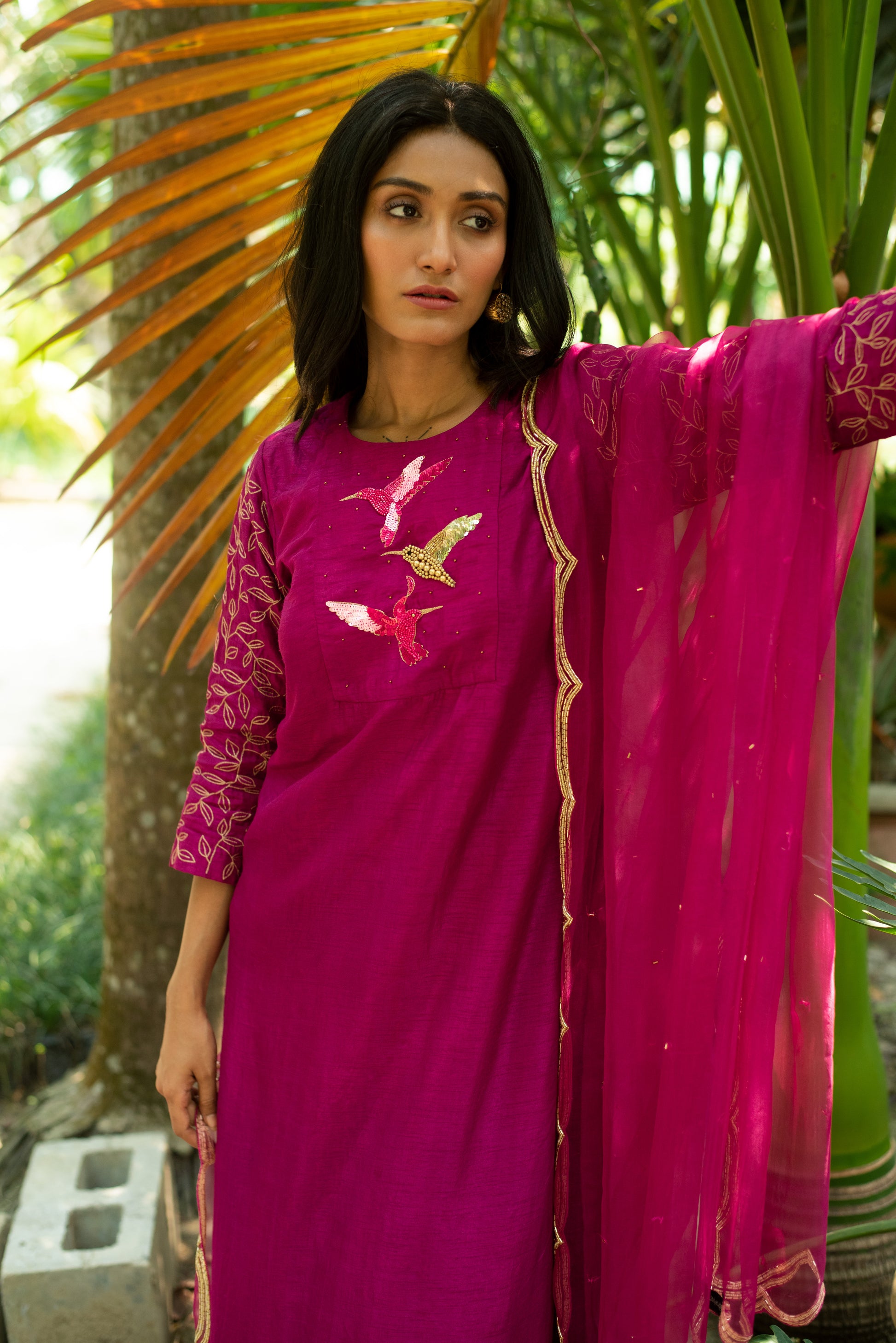 This elegant A-line kurta features intricate embroidery details and a beautiful scalloped hemline, paired with comfortable palazzo pants and a matching dupatta.