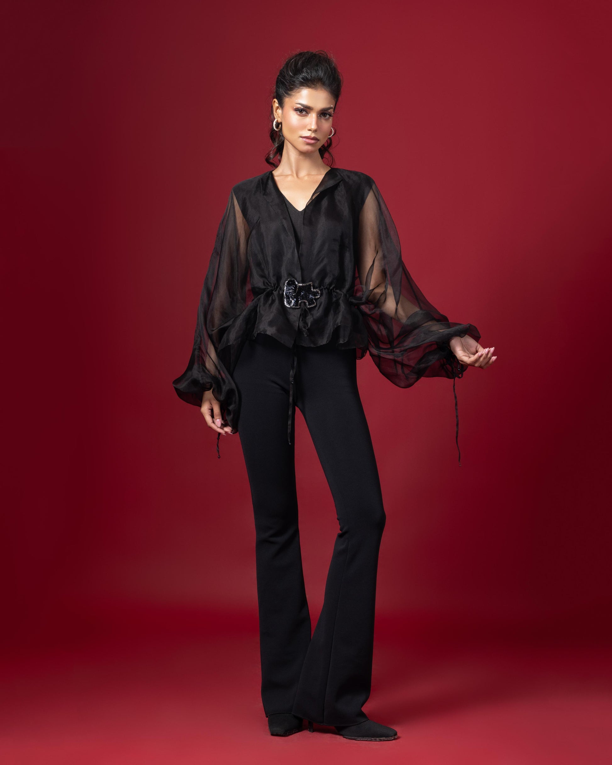 Embellished oversize gathered top with waist tie up