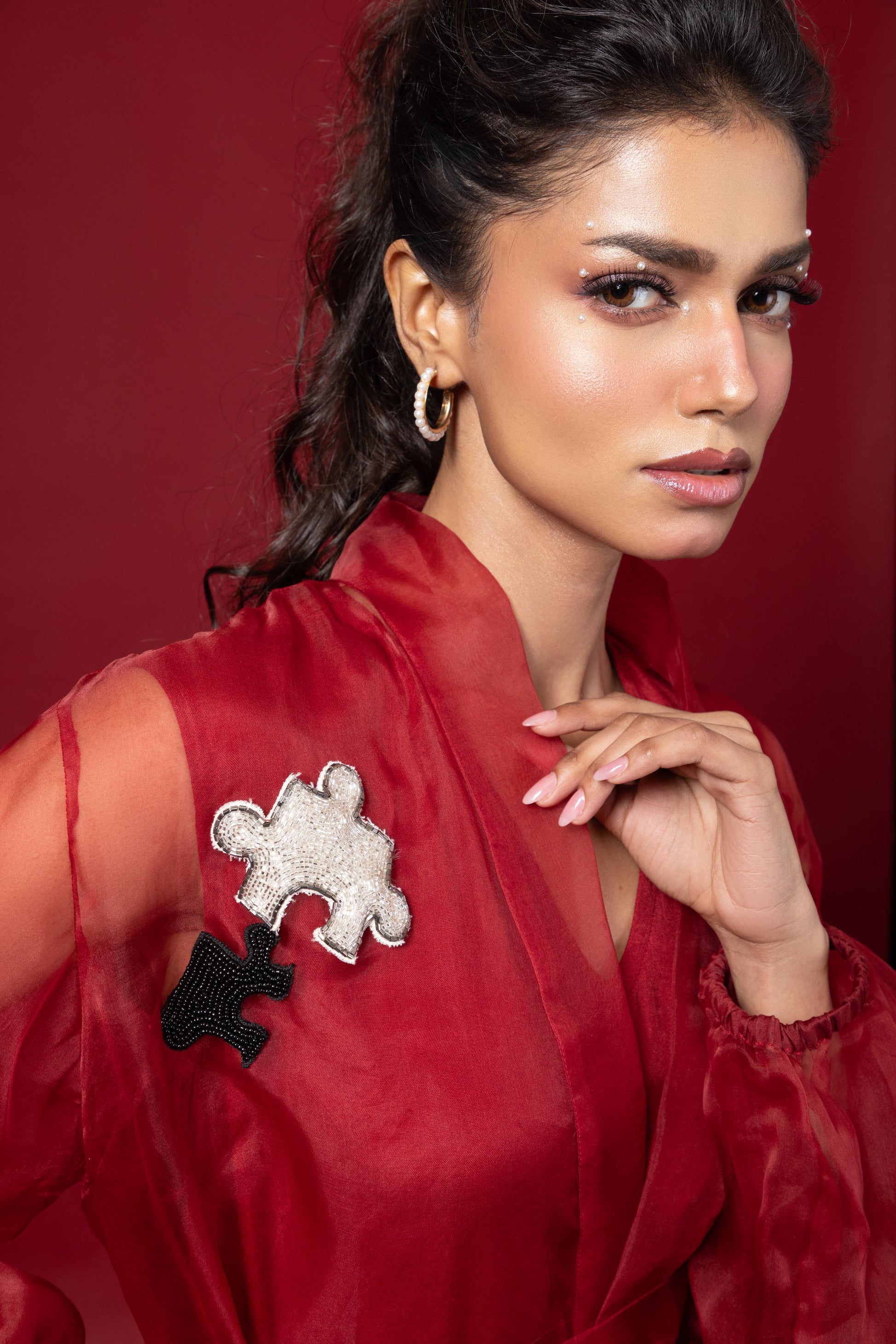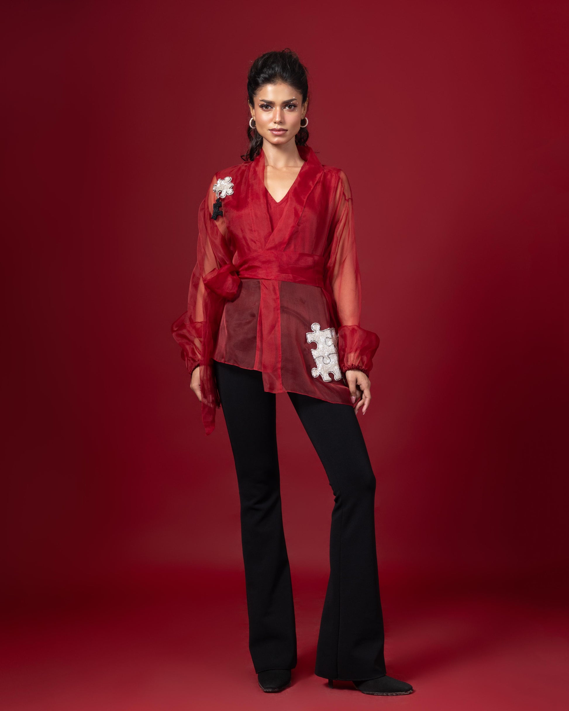 Oversized embellished top with waist tie belt