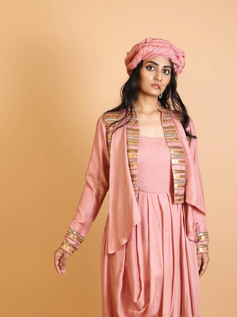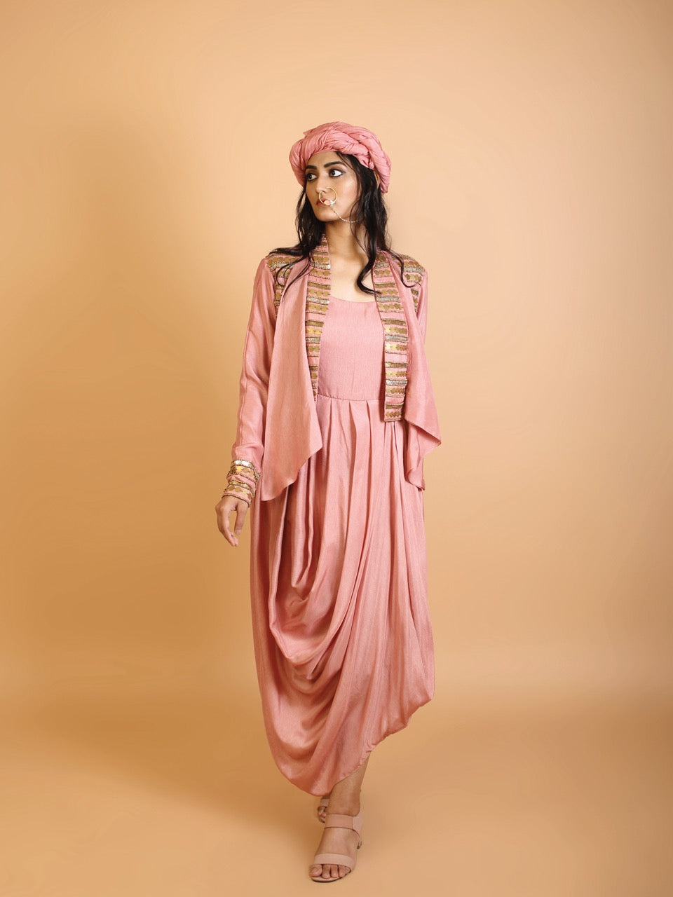 Cowl drape with embroidered full sleeve jacket