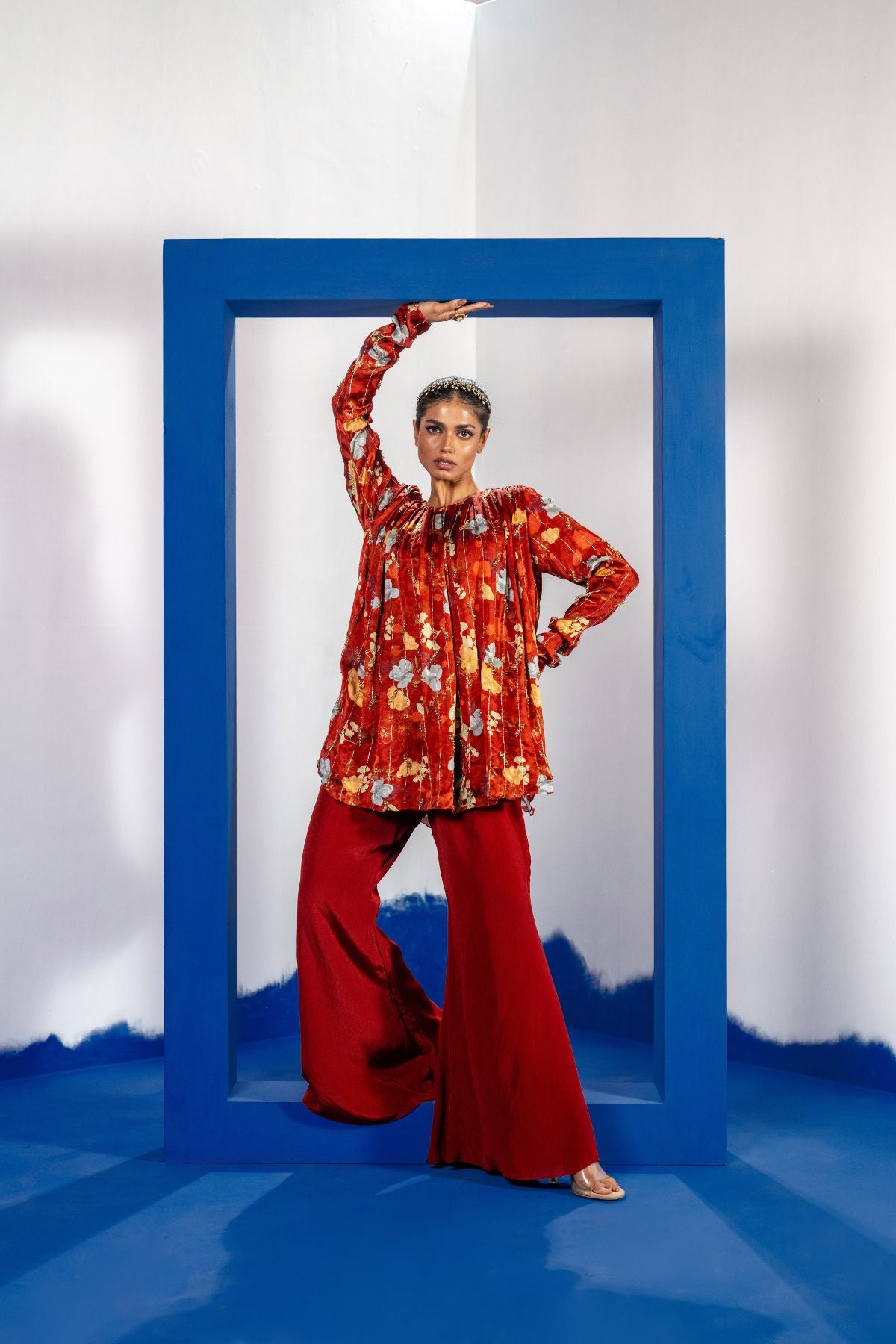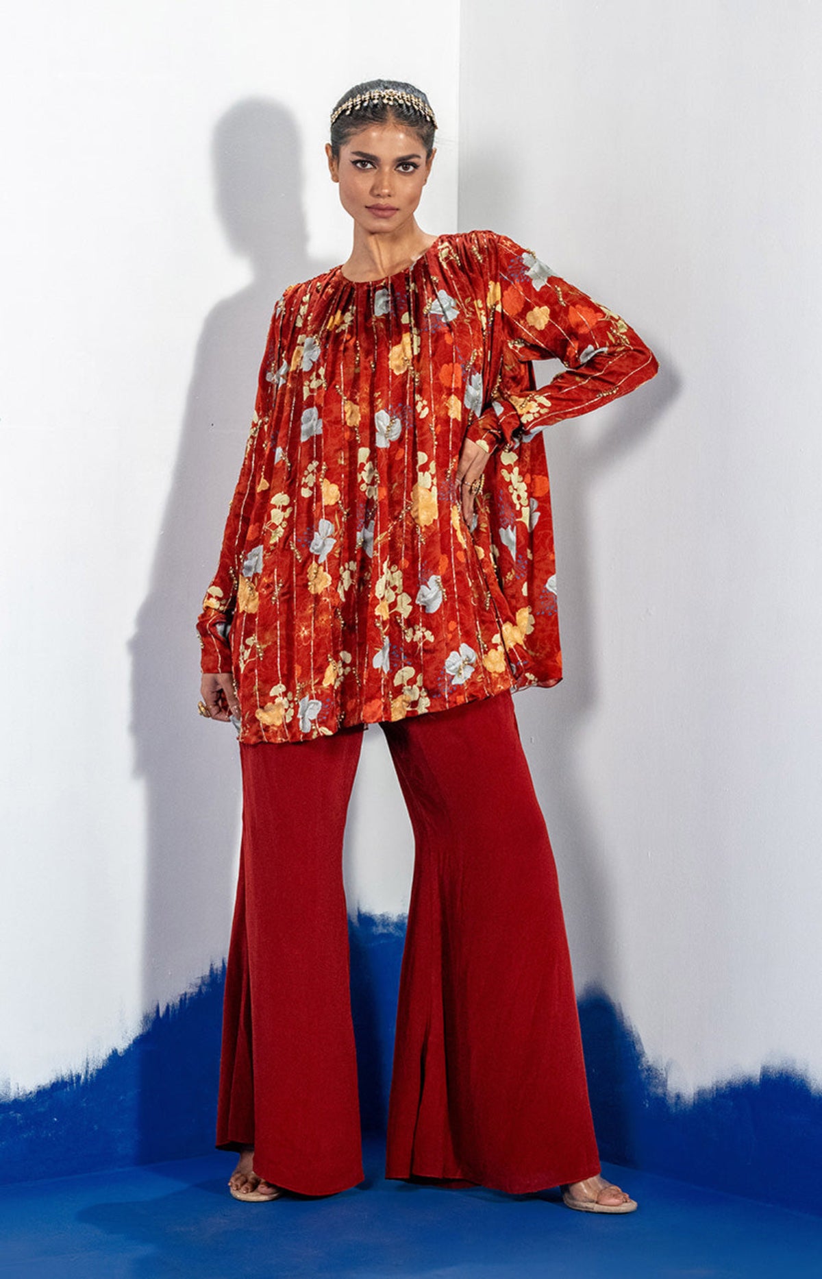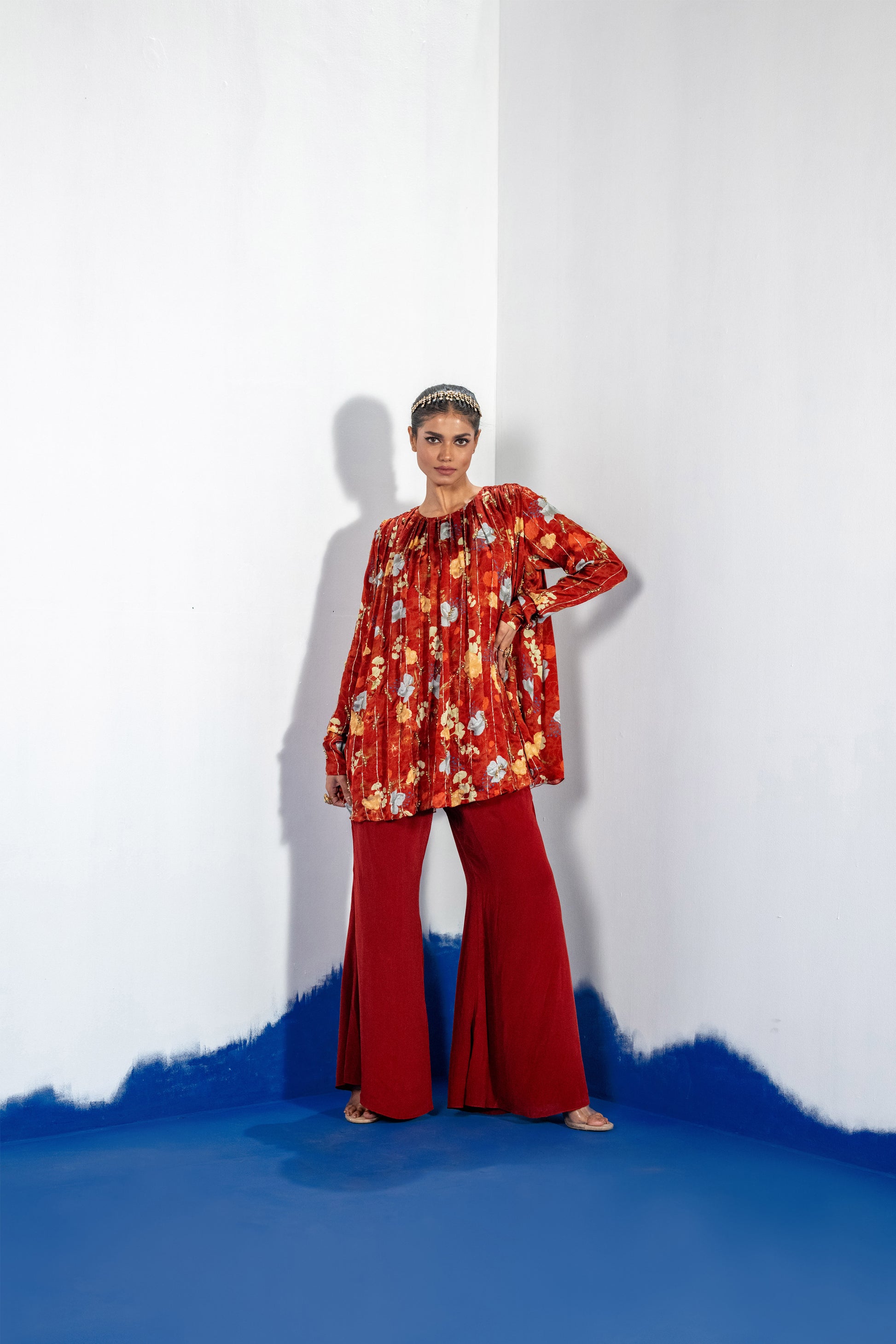 Gathered kurta with fully embroidered churidar sleeves, paired with solid flared pants
