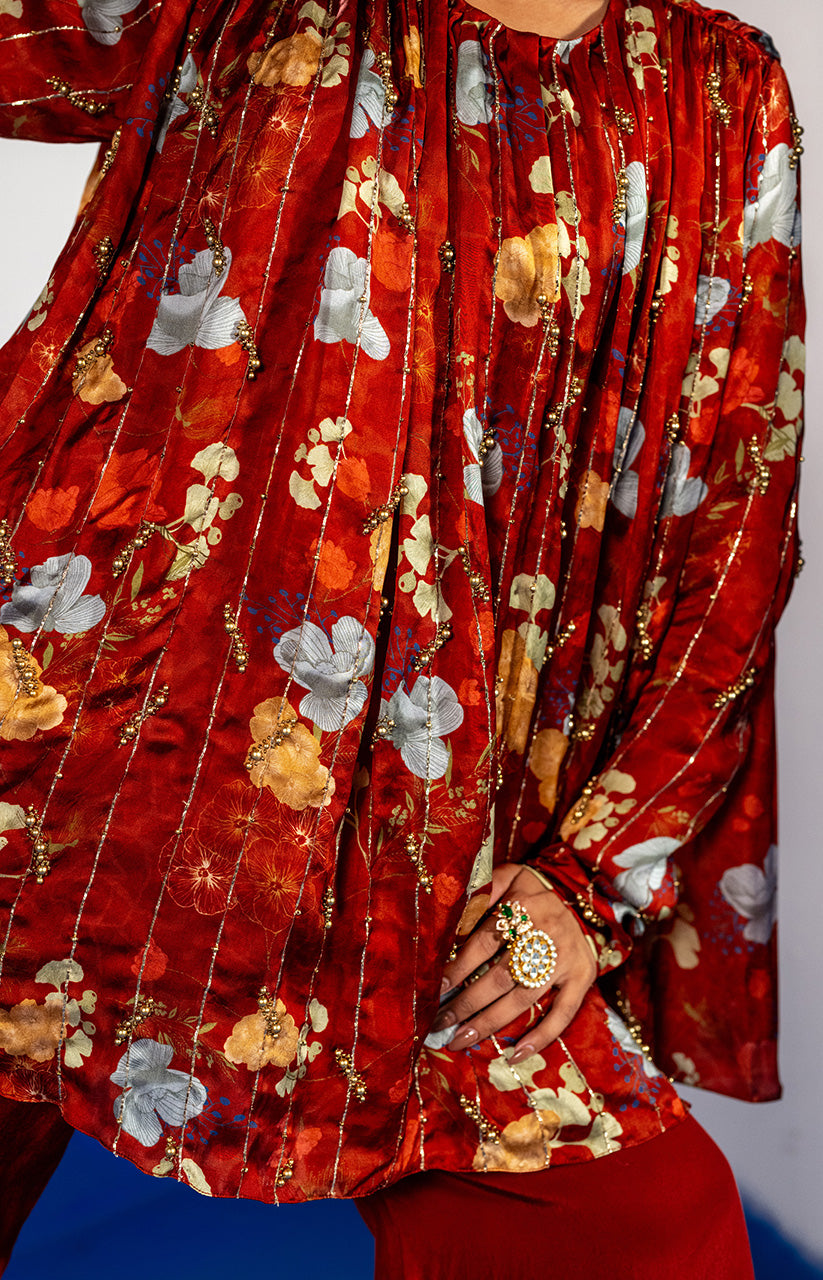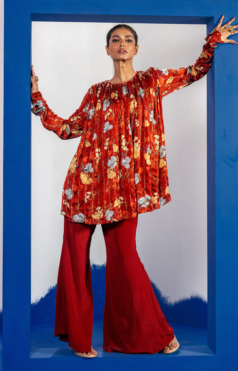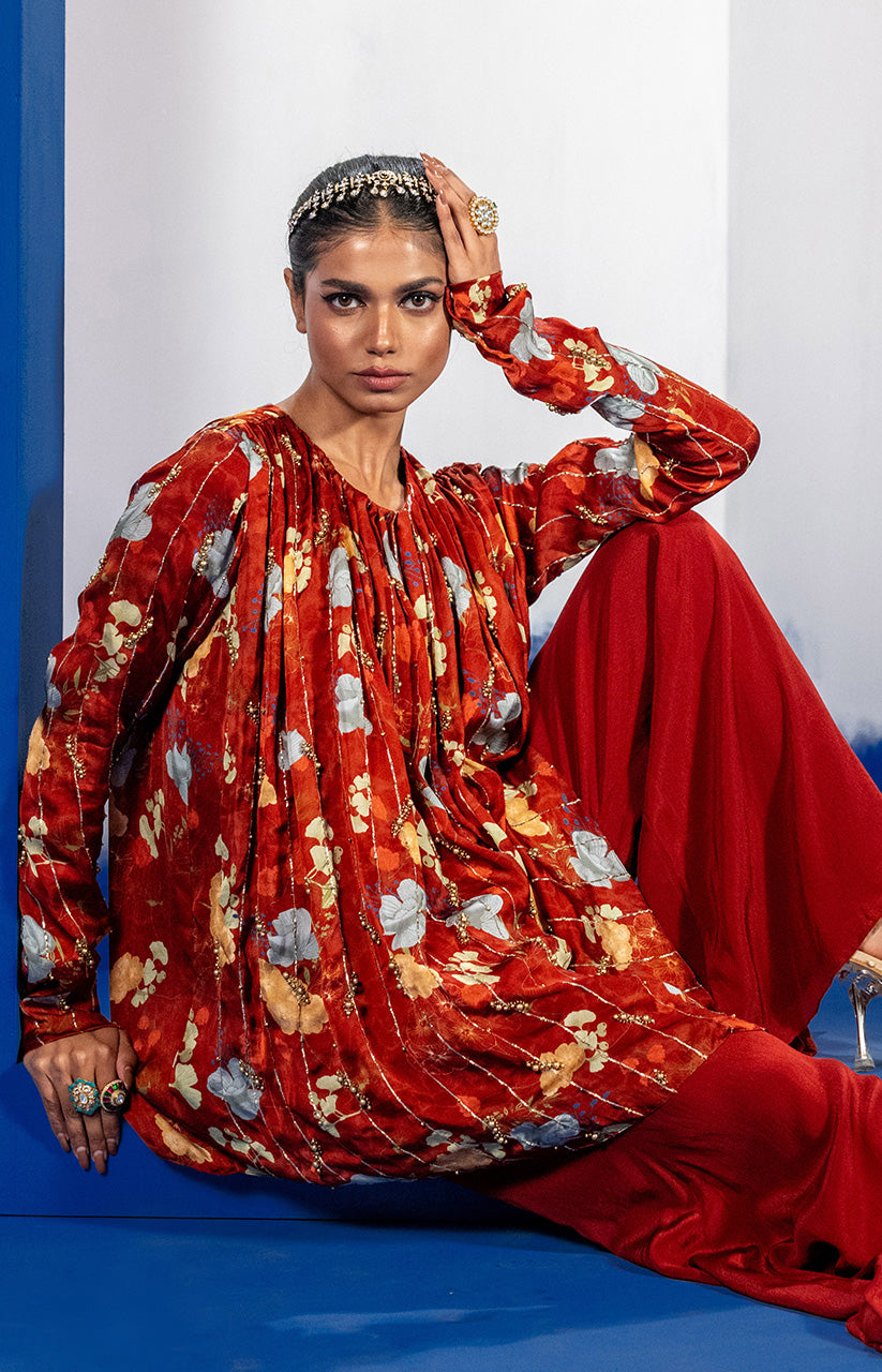 Gathered kurta with fully embroidered churidar sleeves, paired with solid flared pants