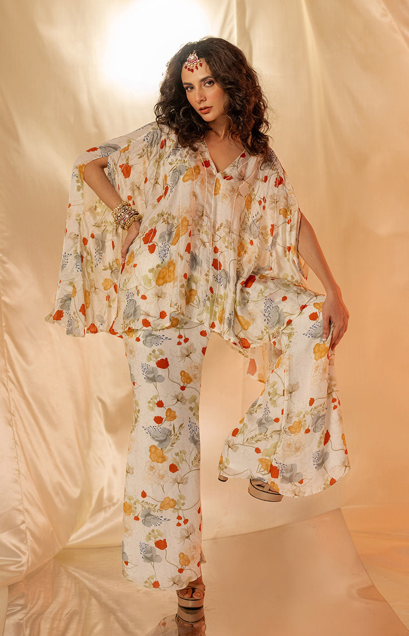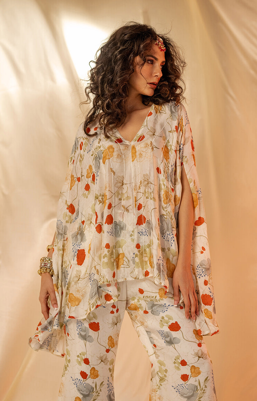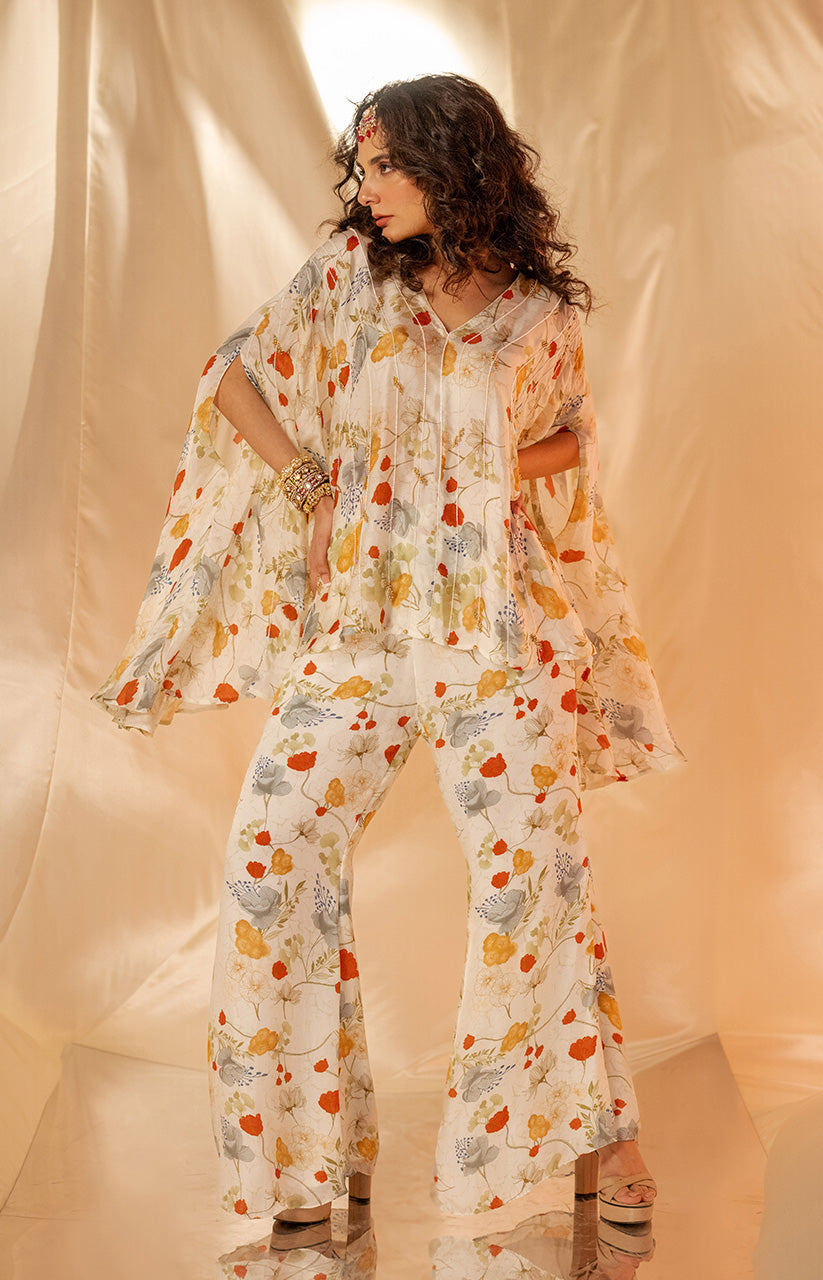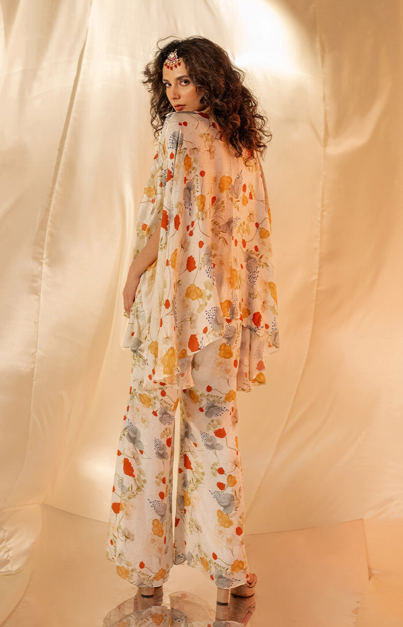 Exaggerated cape style top paired with printed flare pants