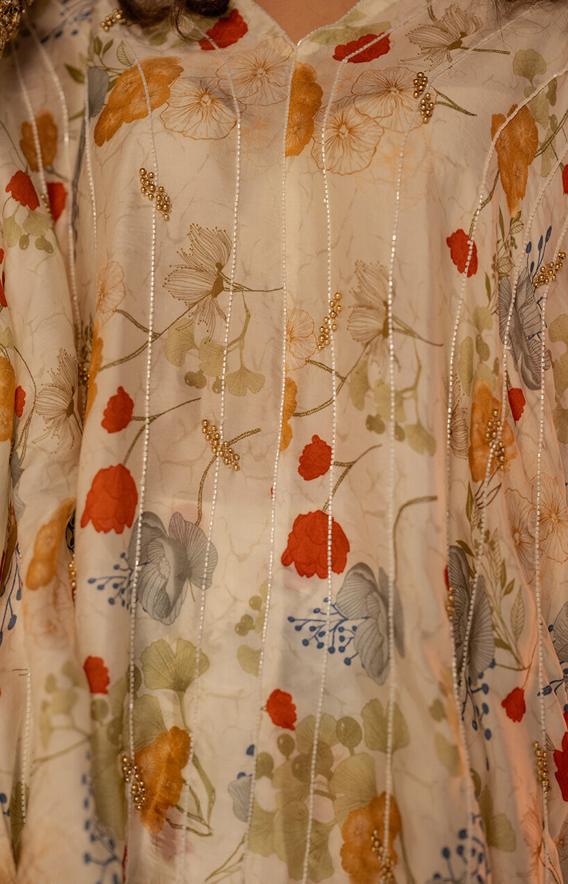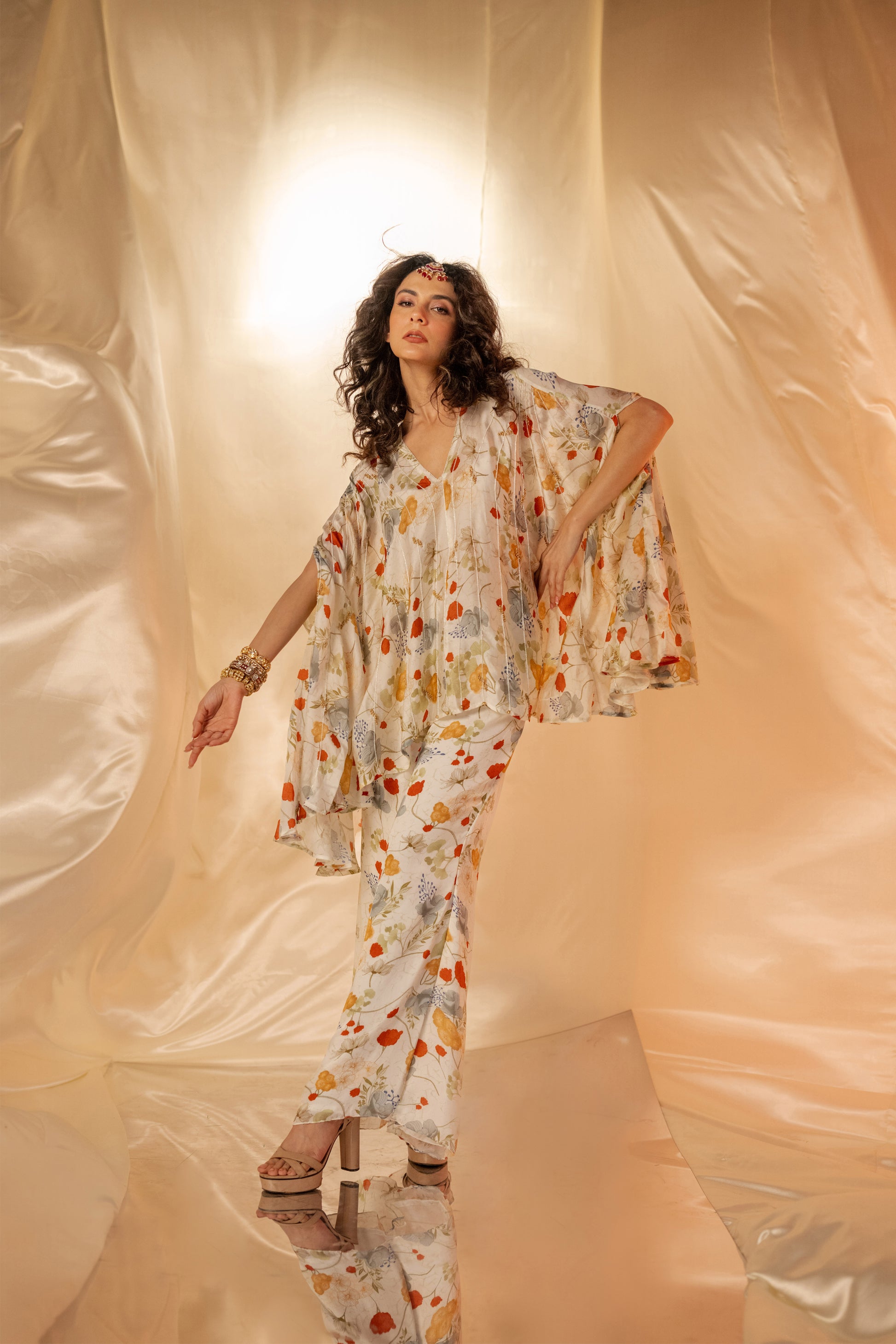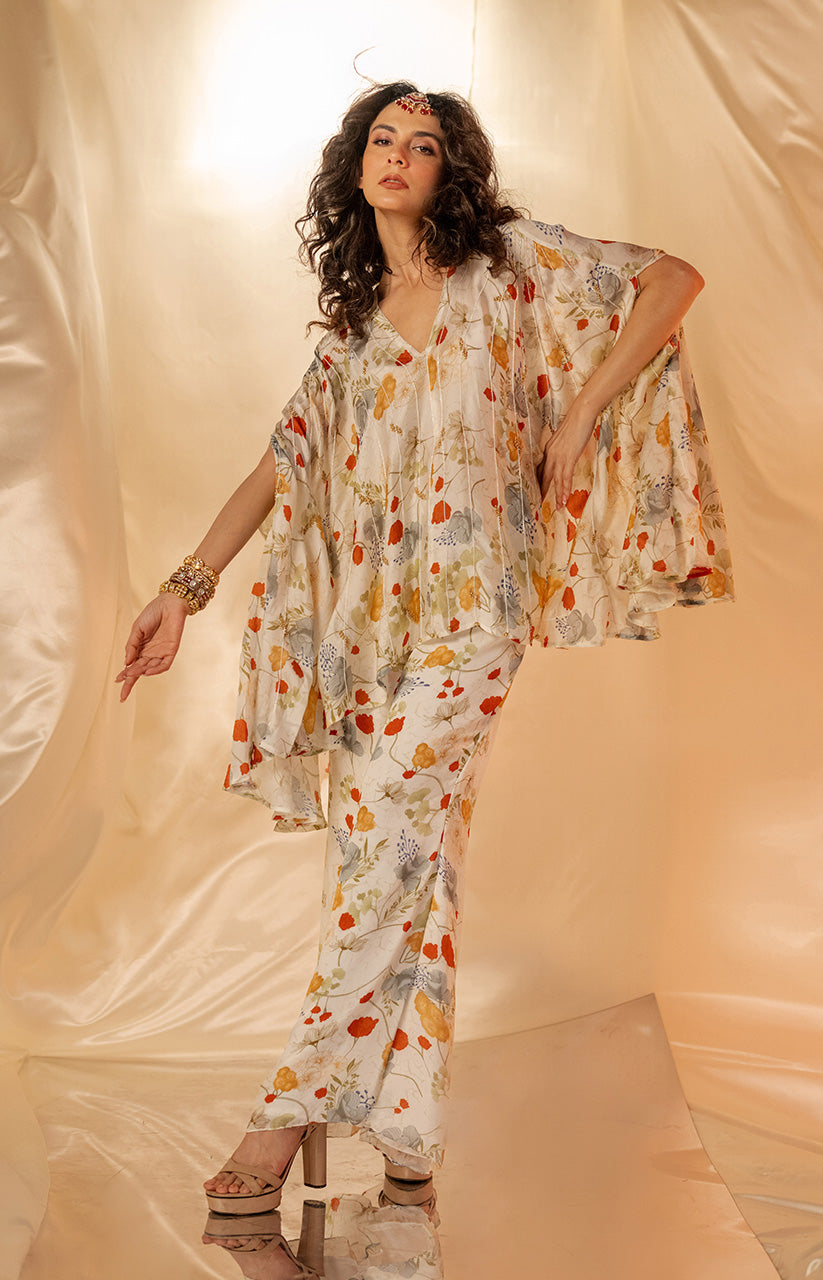 Exaggerated cape style top paired with printed flare pants