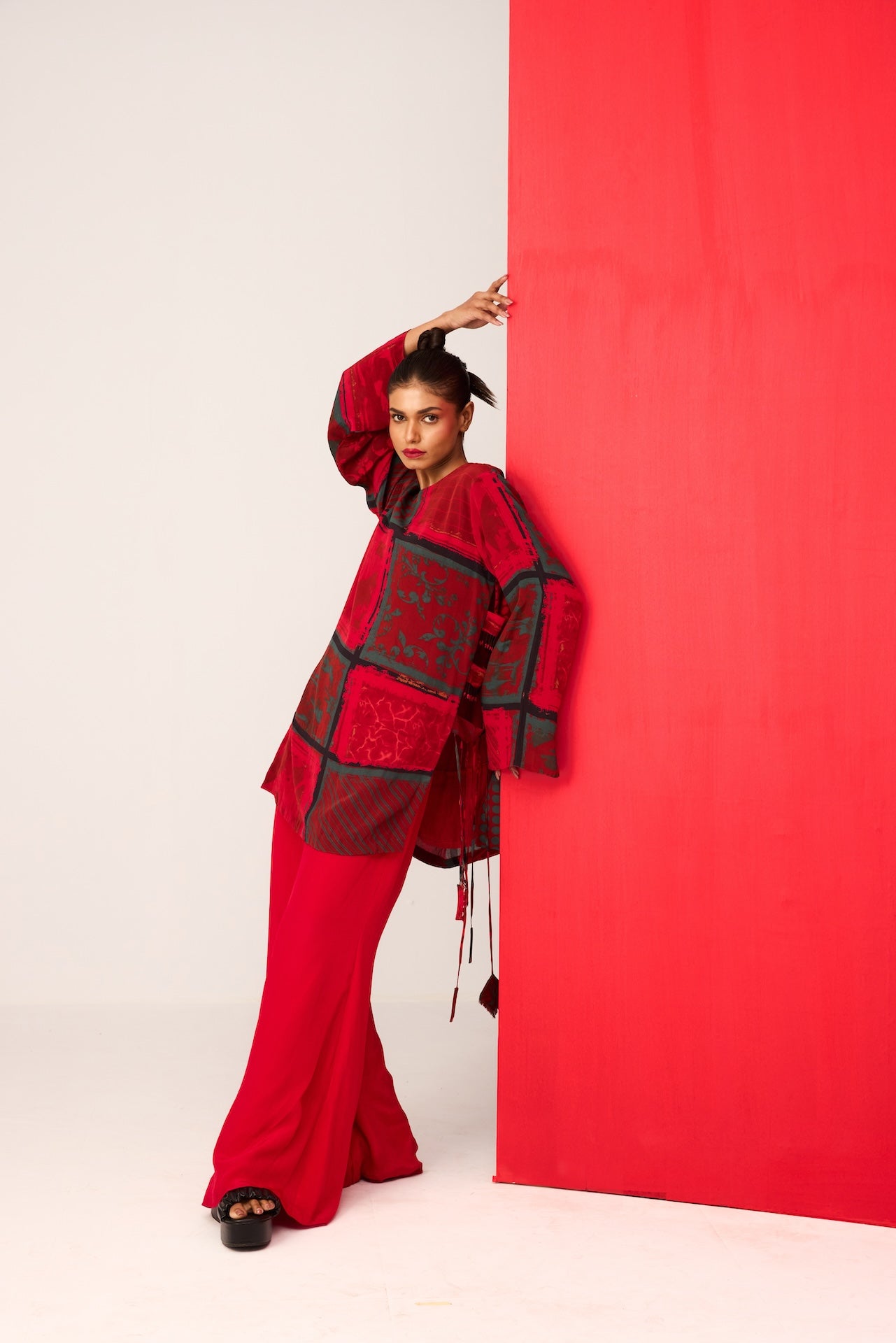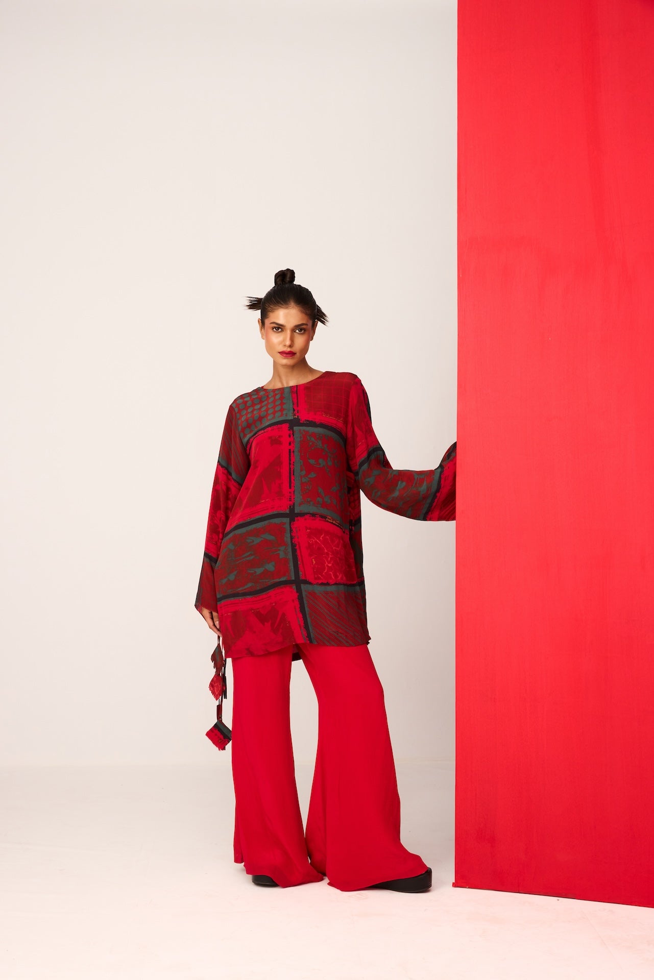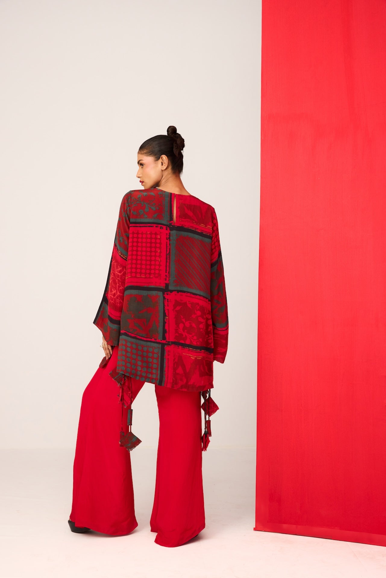 Box fit full-sleeve top with side seam fringe details paired with solid flared pants