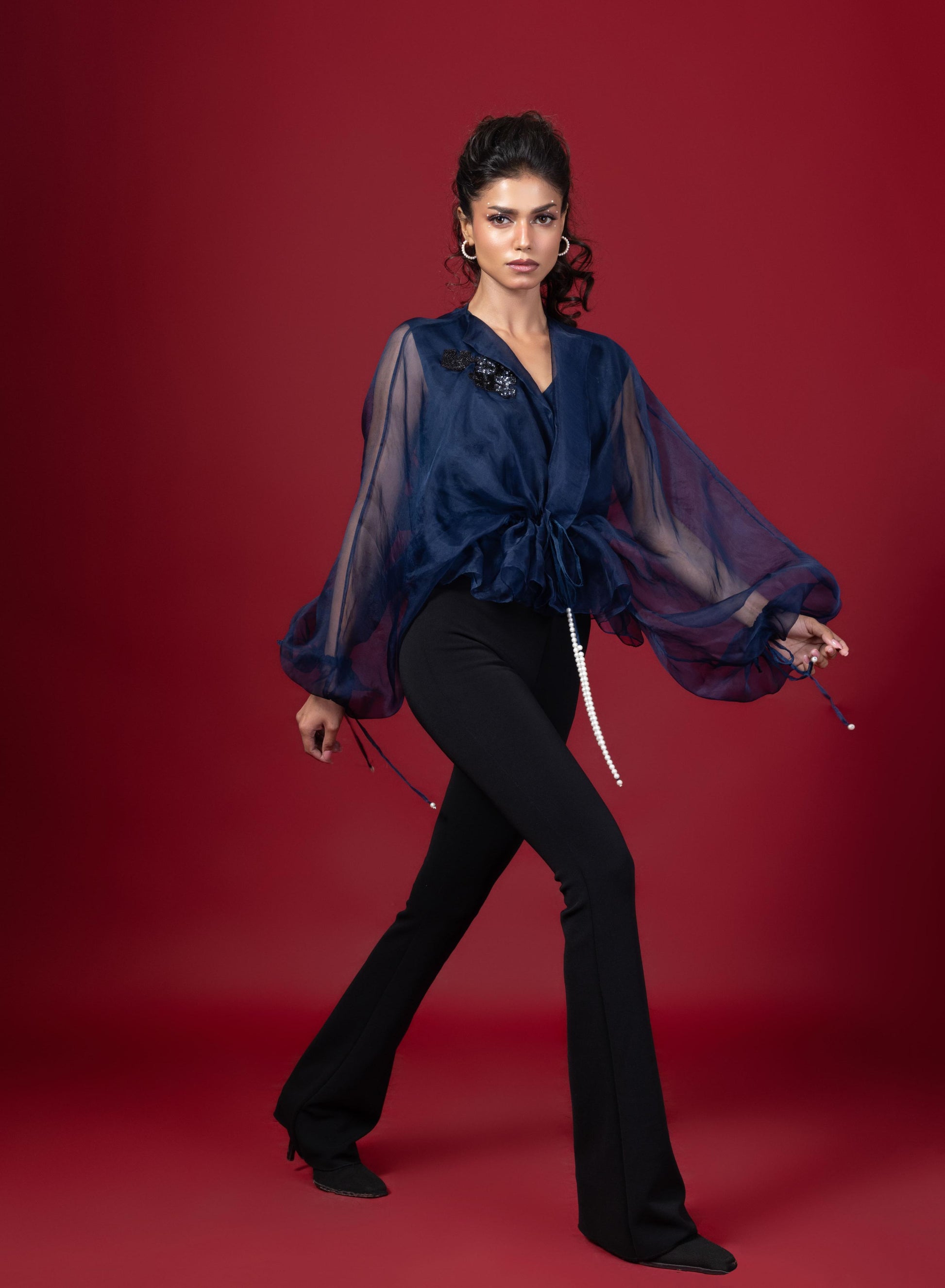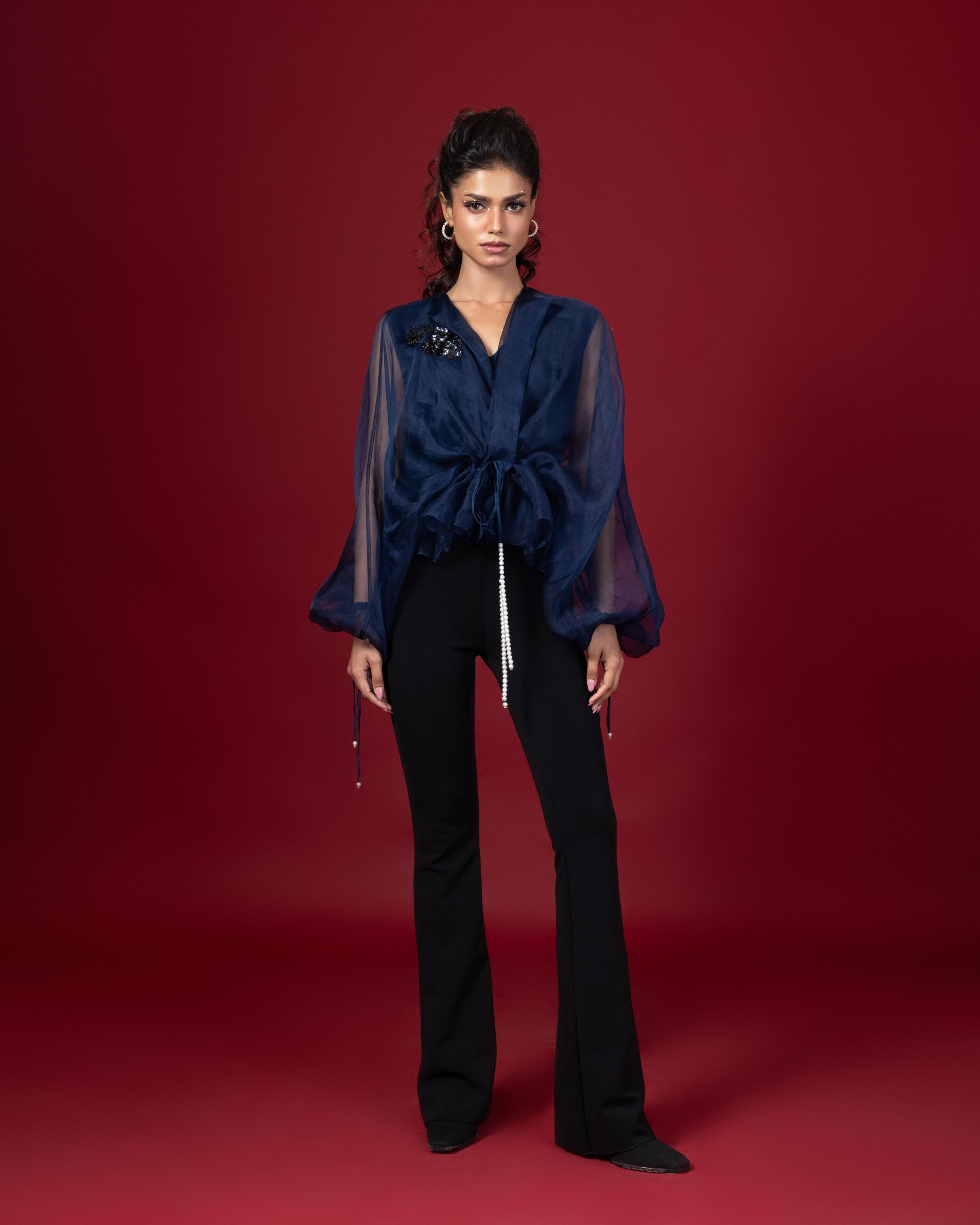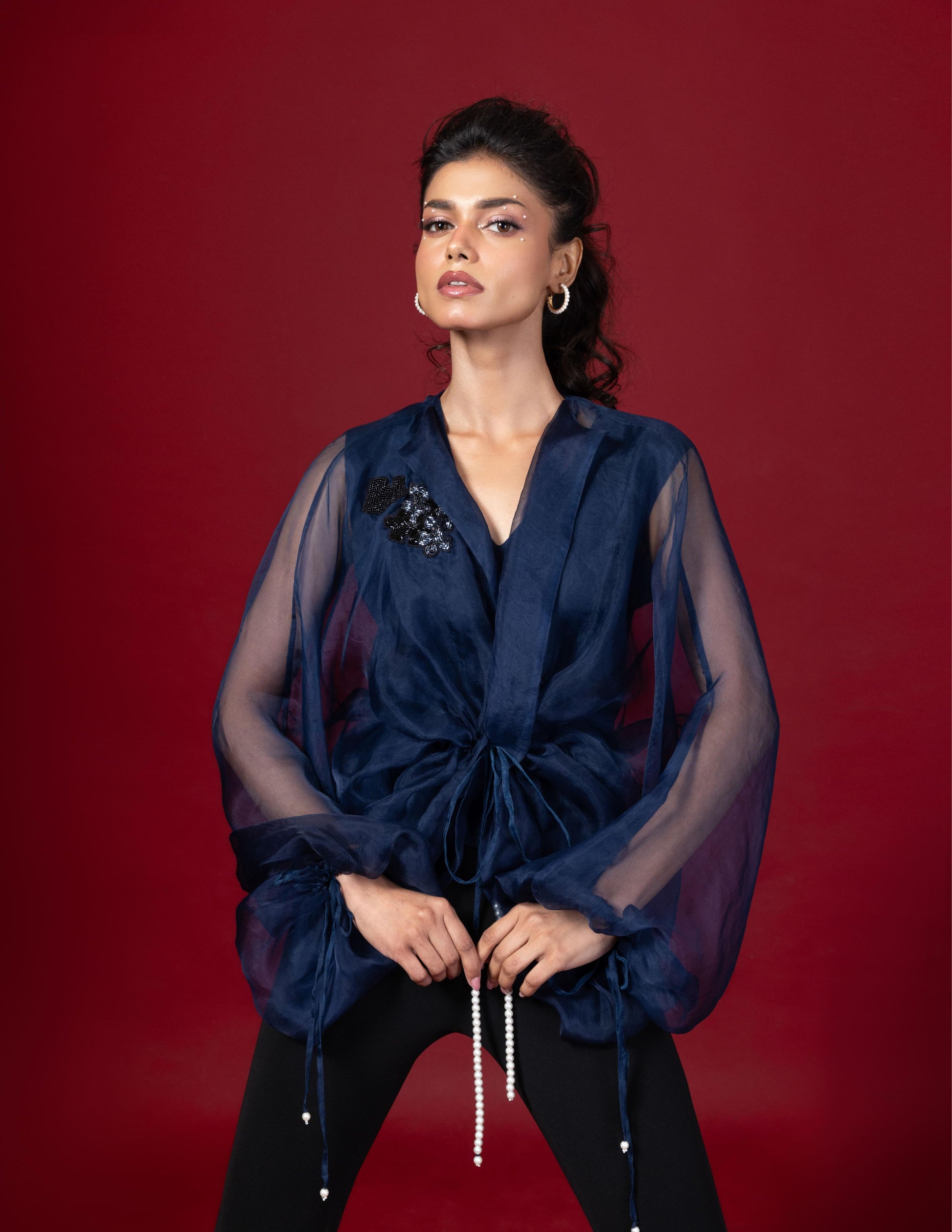Embellished oversize gathered top with waist tie up