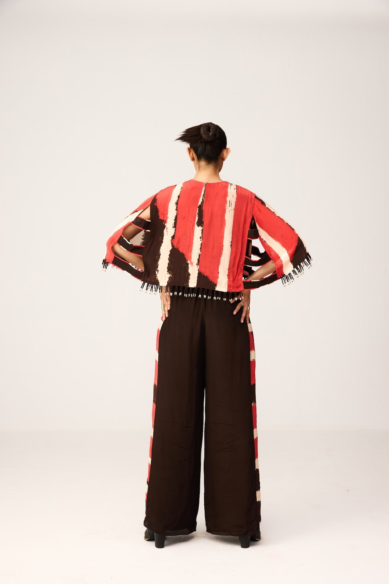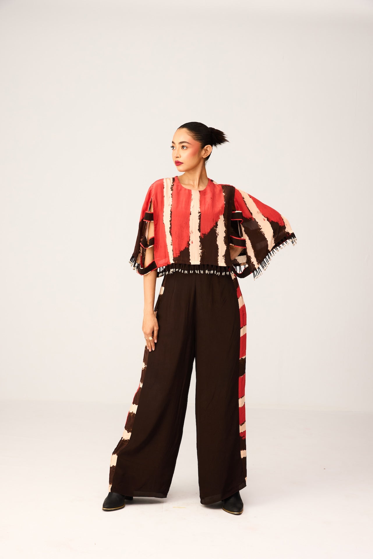 Cape crop top with fringe details paired with bustier and pants