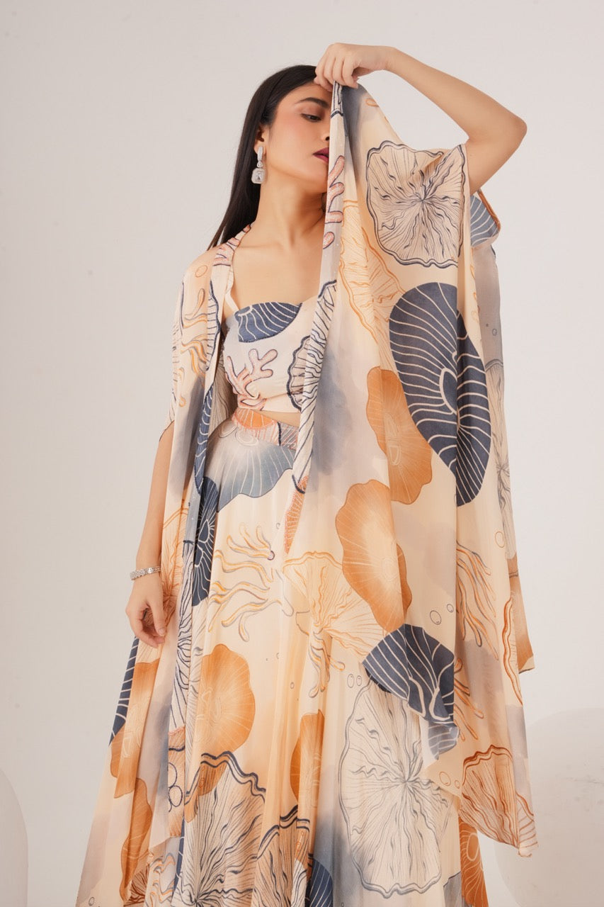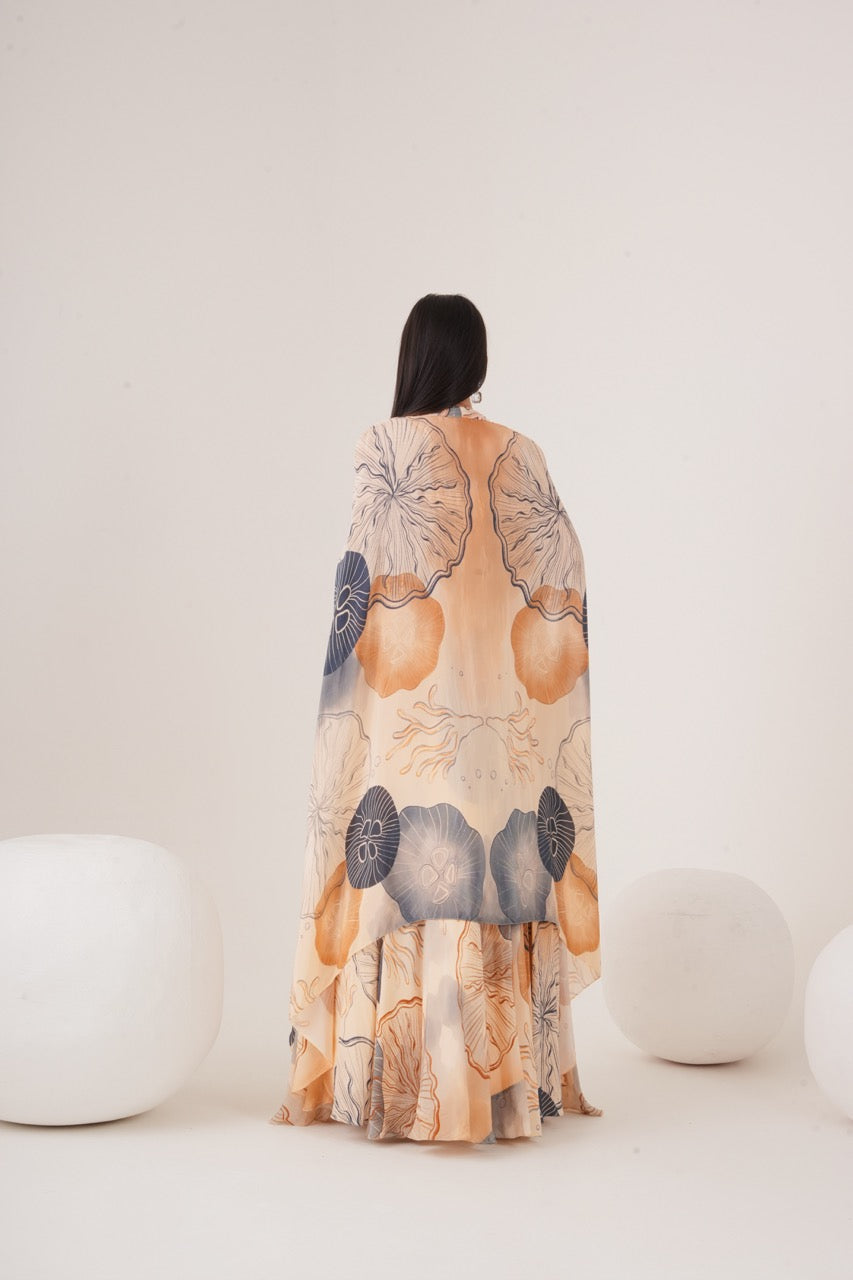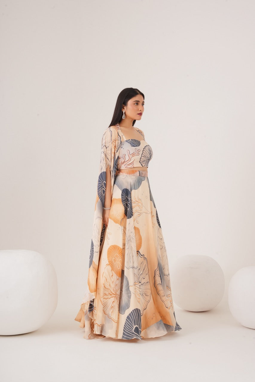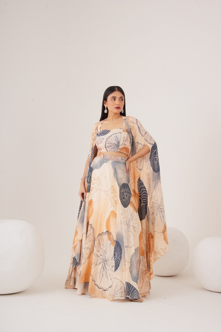 Cape set with embellished bralette paired with circular skirt