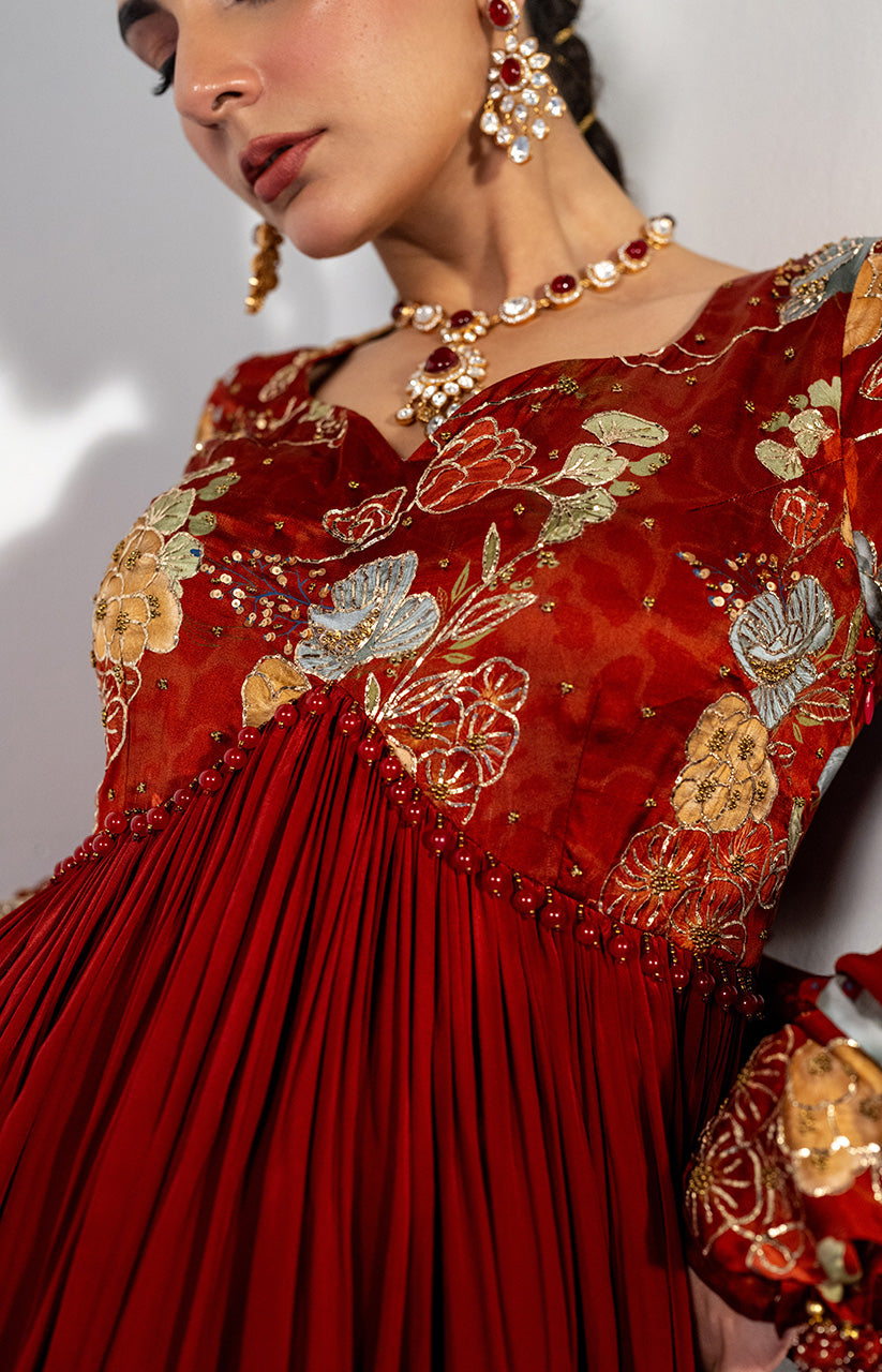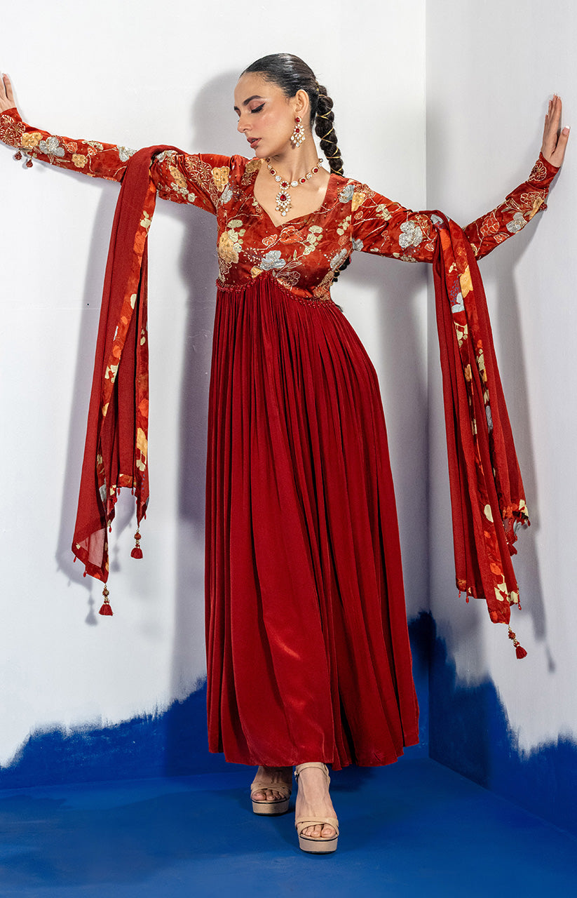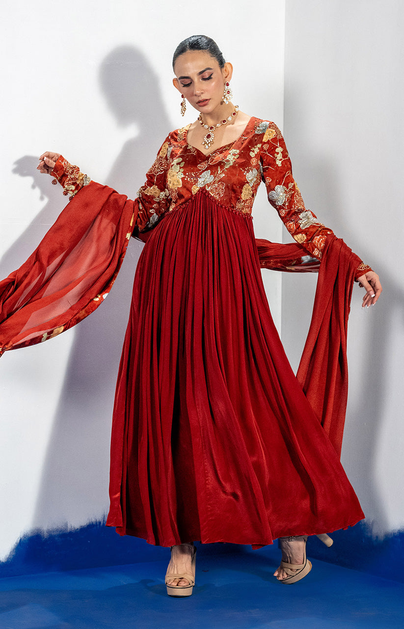 Anarkali with embroidered yoke and churi sleeves paired with chiffon dupatta