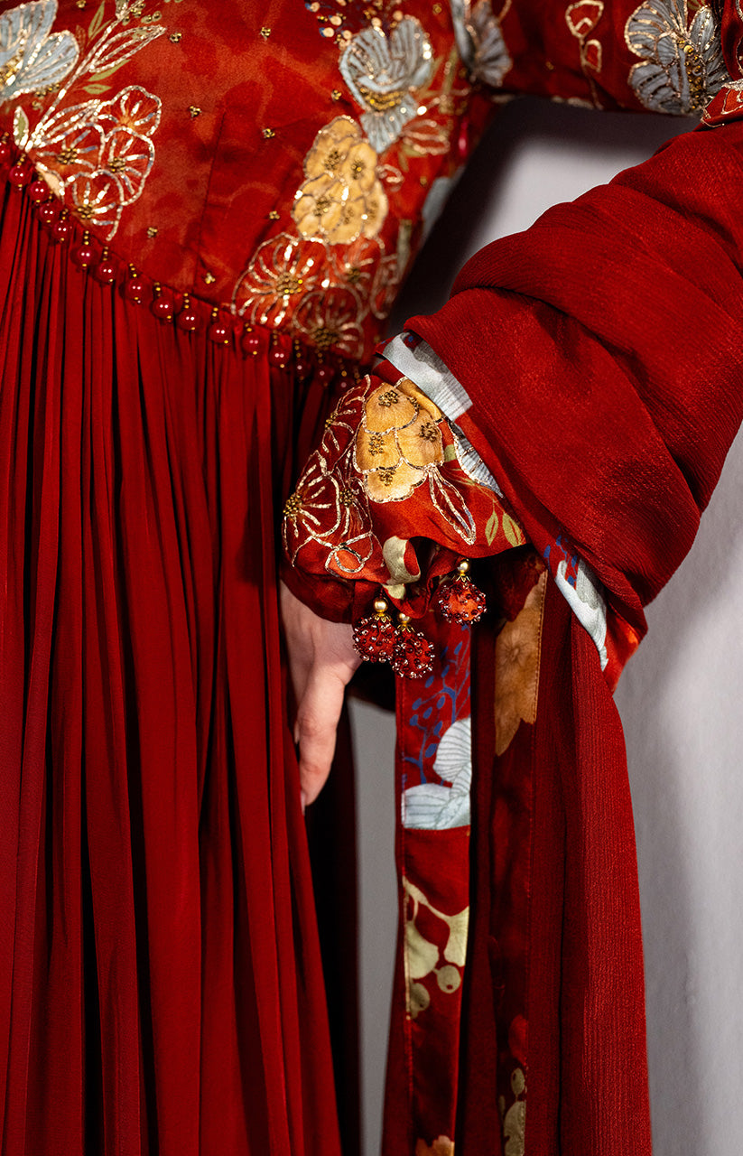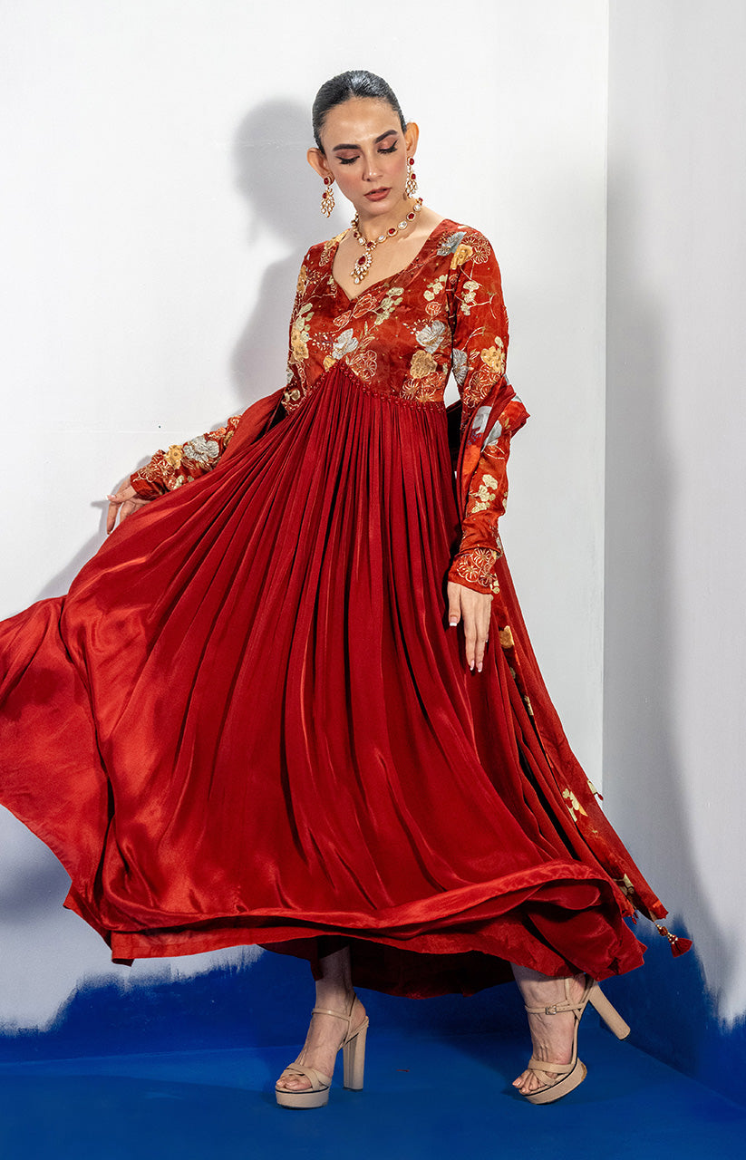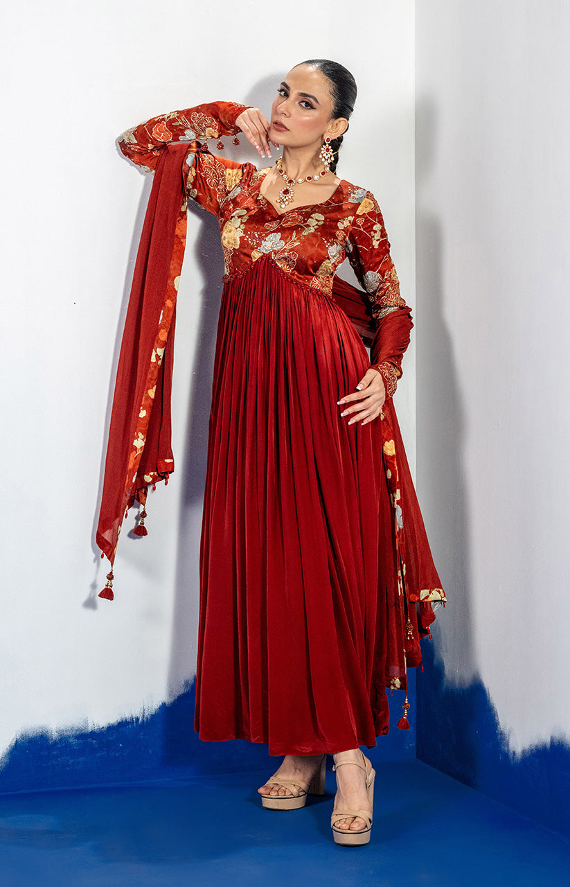 Anarkali with embroidered yoke and churi sleeves paired with chiffon dupatta