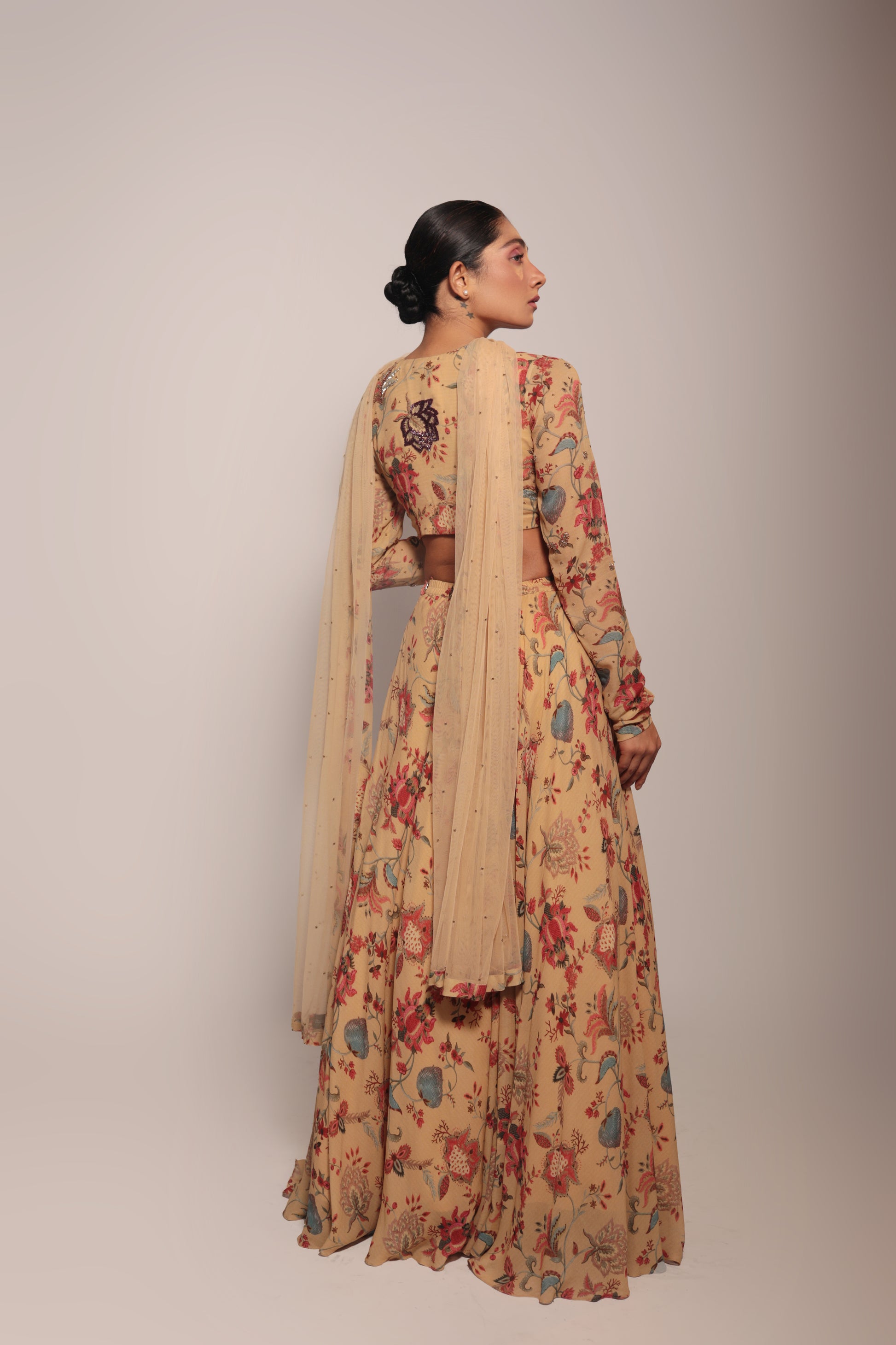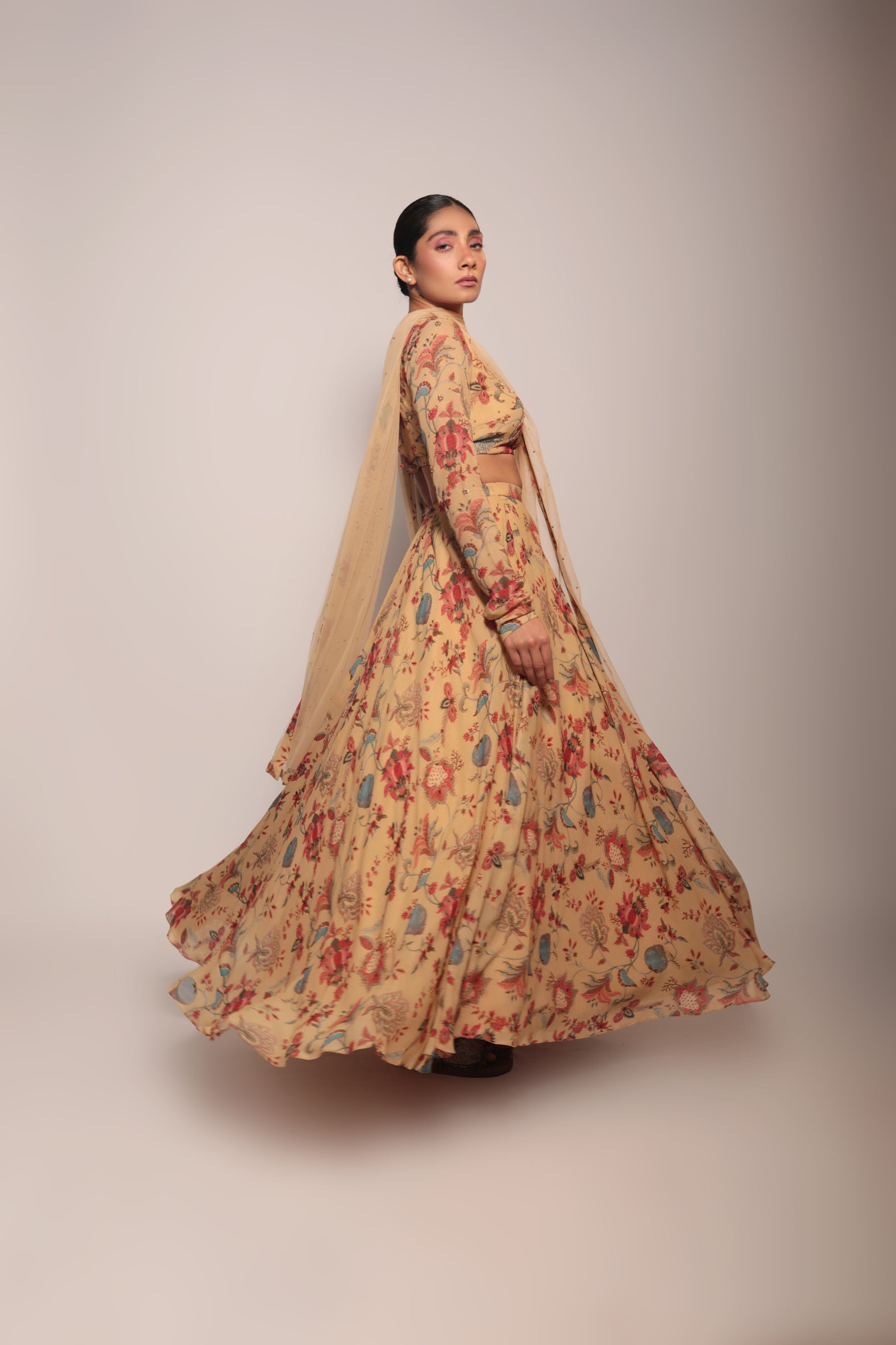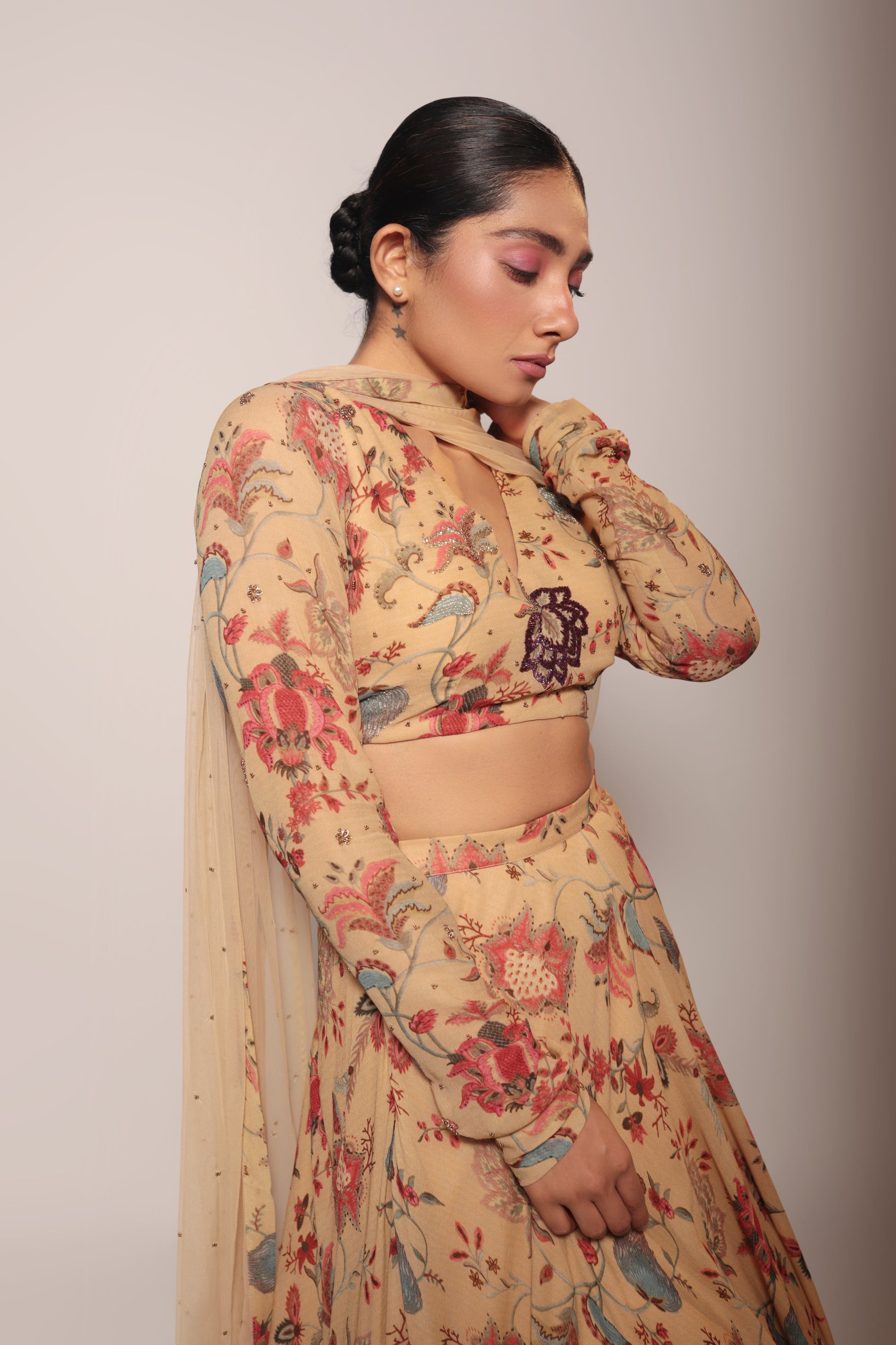Embellished churi - sleeves blouse with skirt and dupatta.