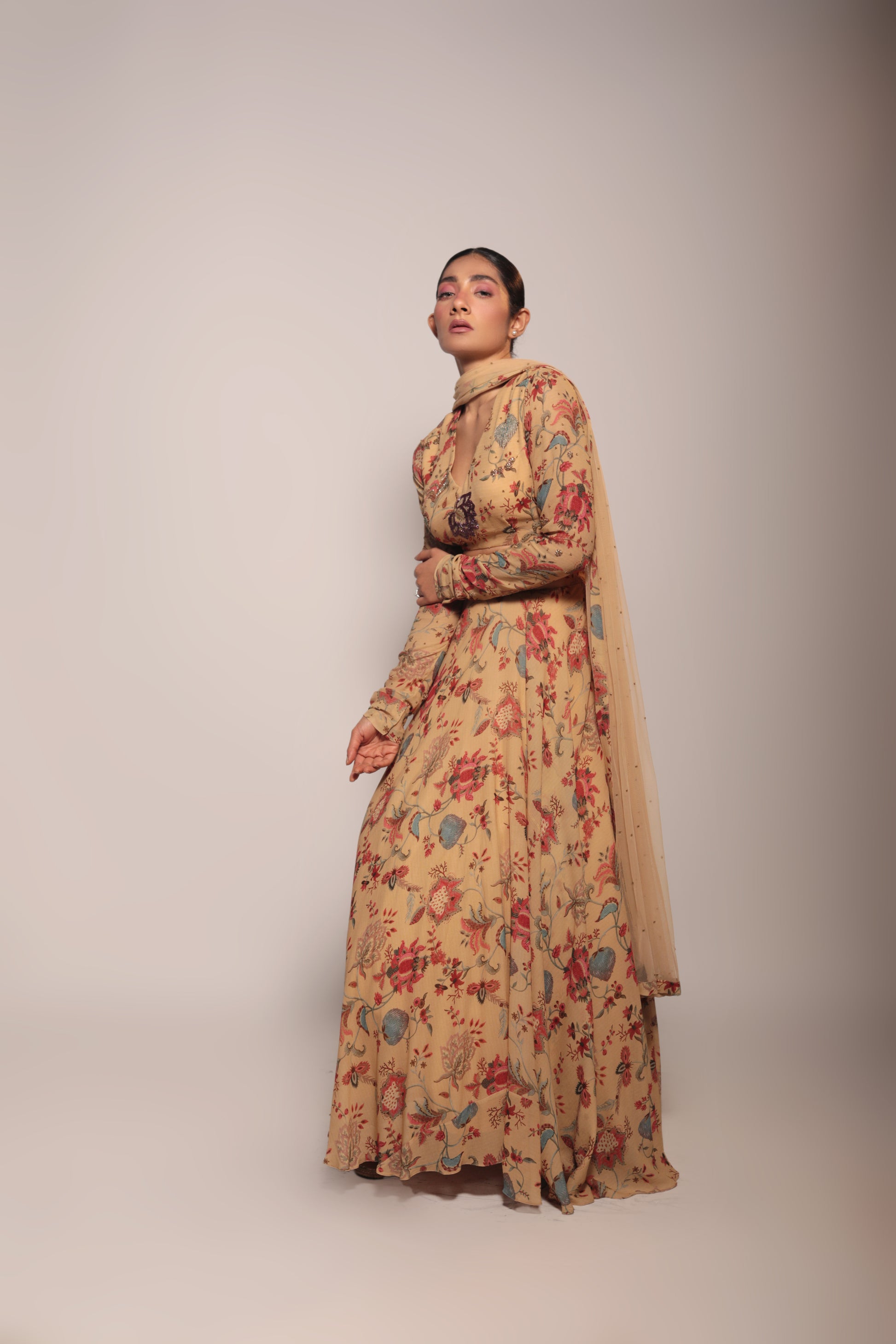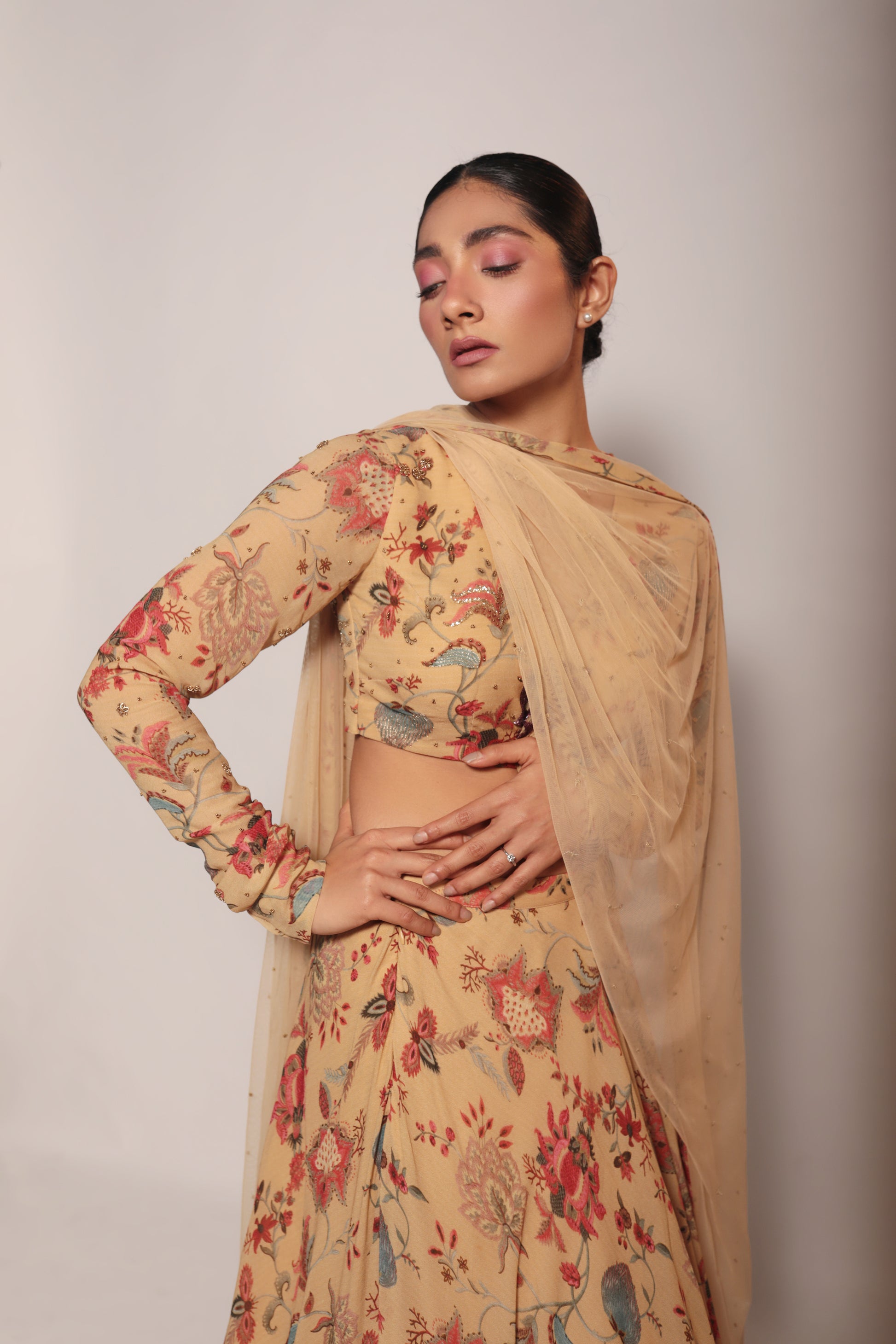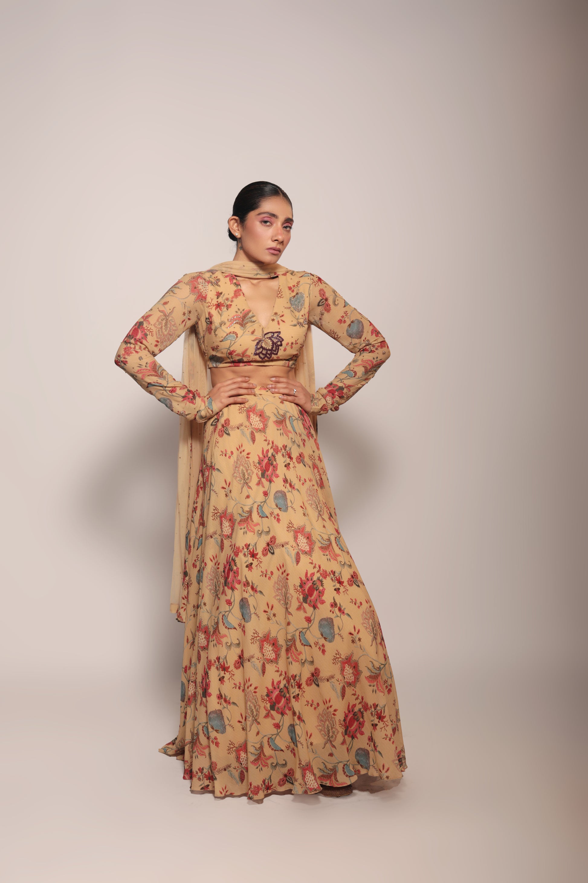 Embellished churi - sleeves blouse with skirt and dupatta.