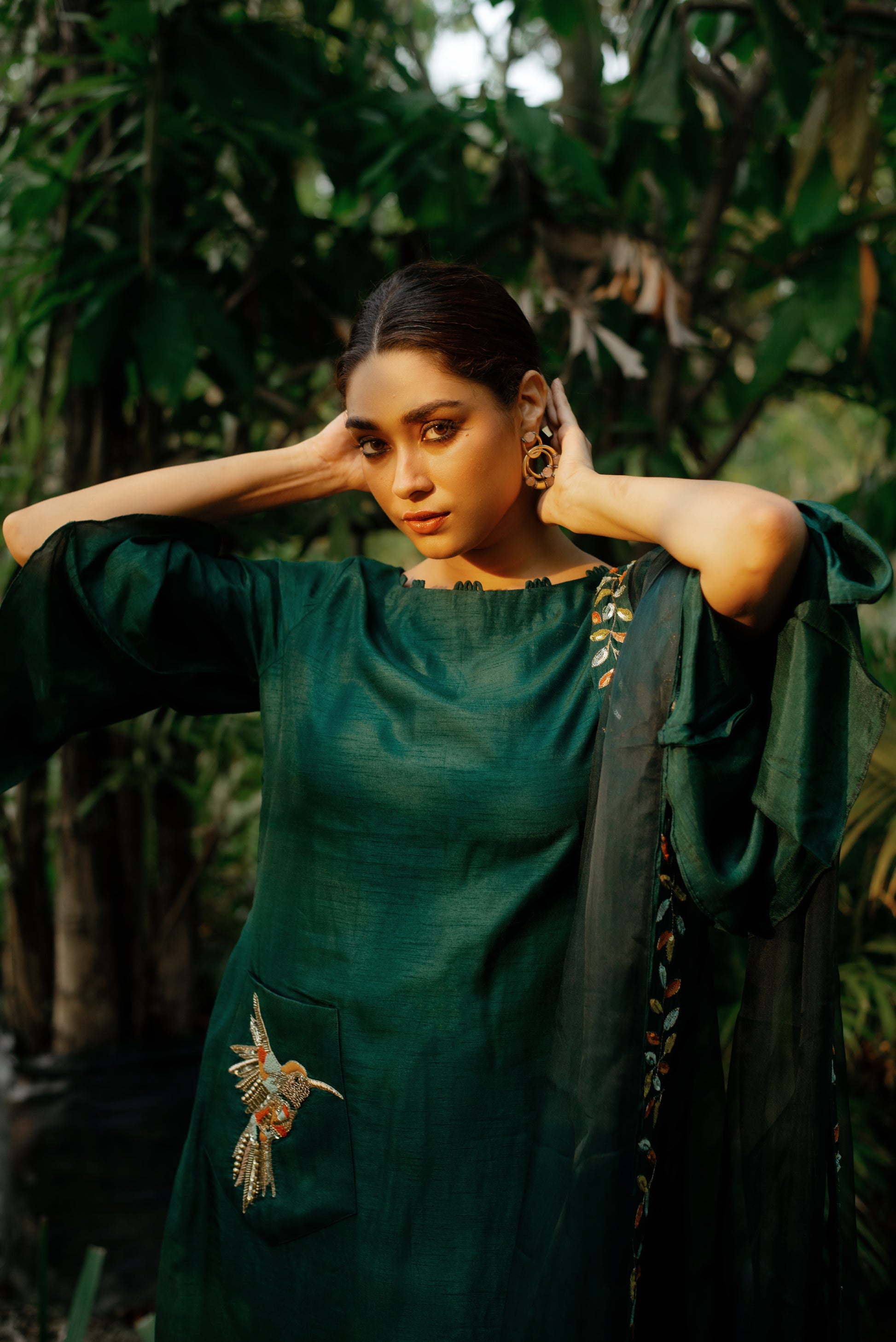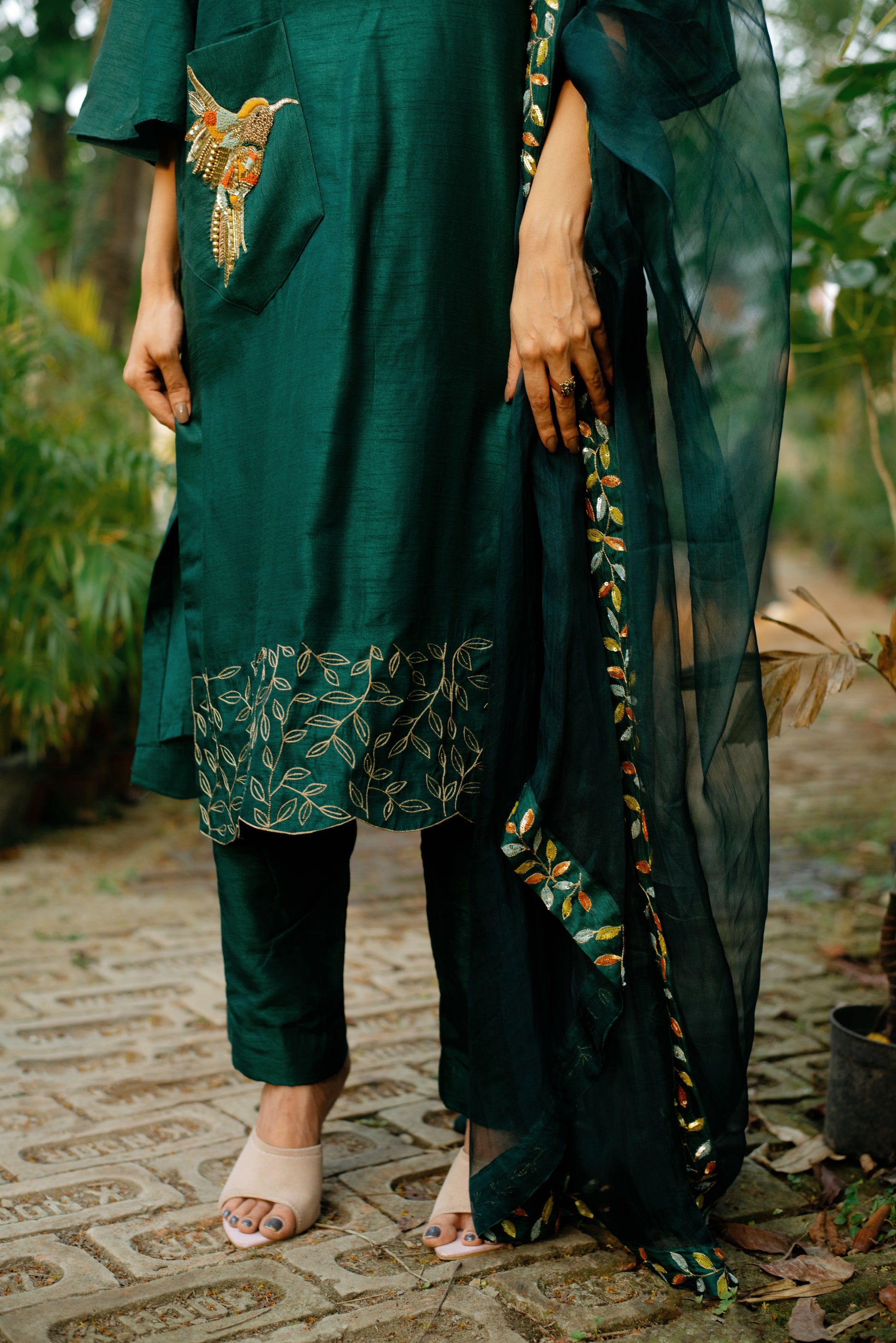 This stylish A-line kurta features a boat neck, pleated sleeves, scallop hemline, and patched pocket design with hand embroidery, paired with straight pants and organza hand embroidered dupatta.