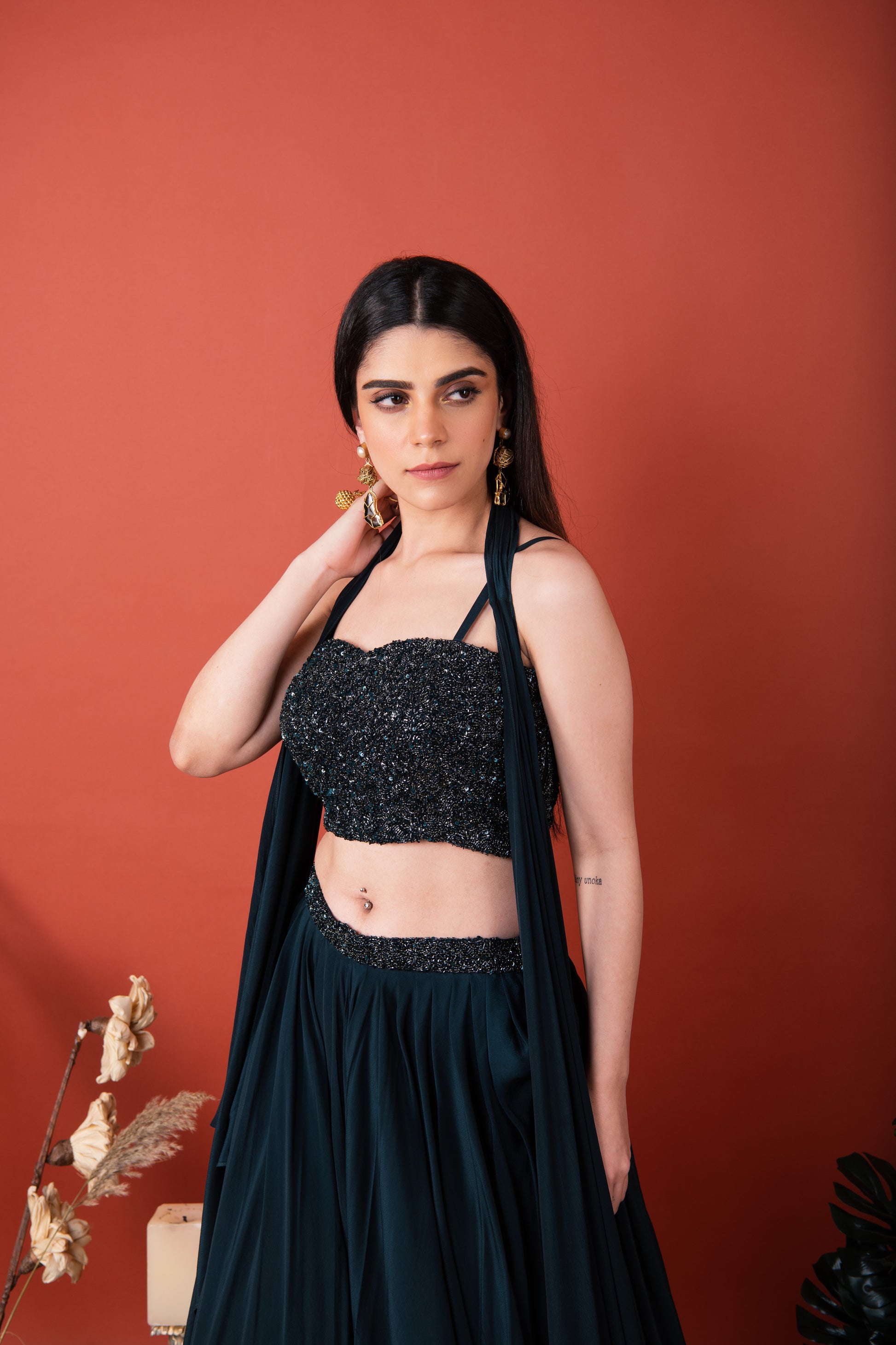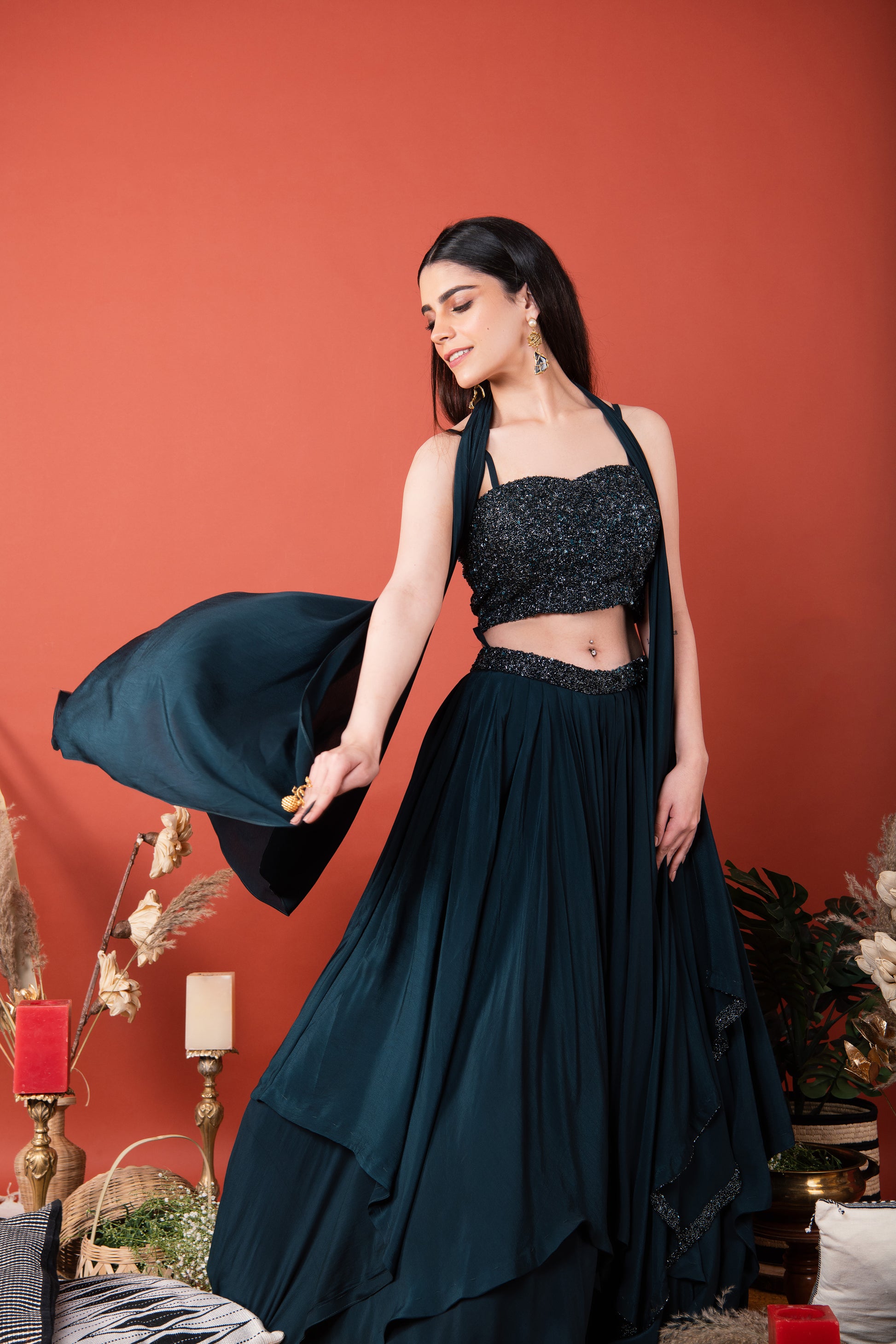 Embellished blouse with layered skirt and semi-embellished dupatta.