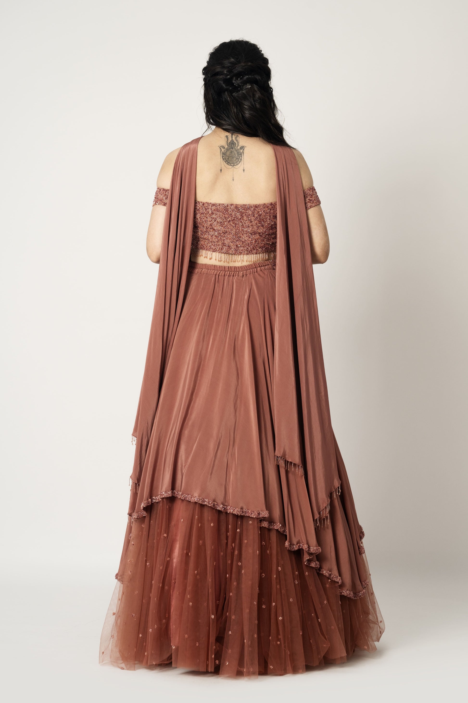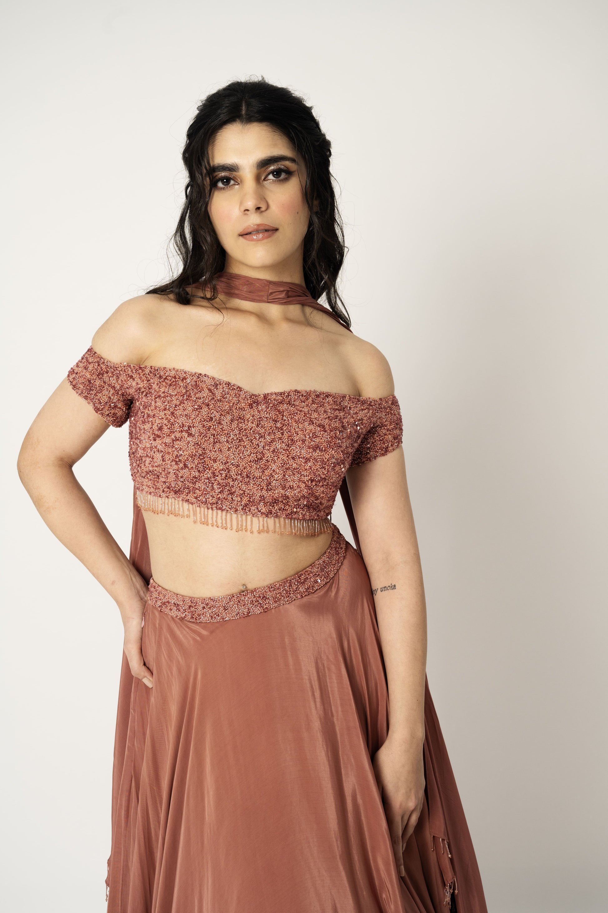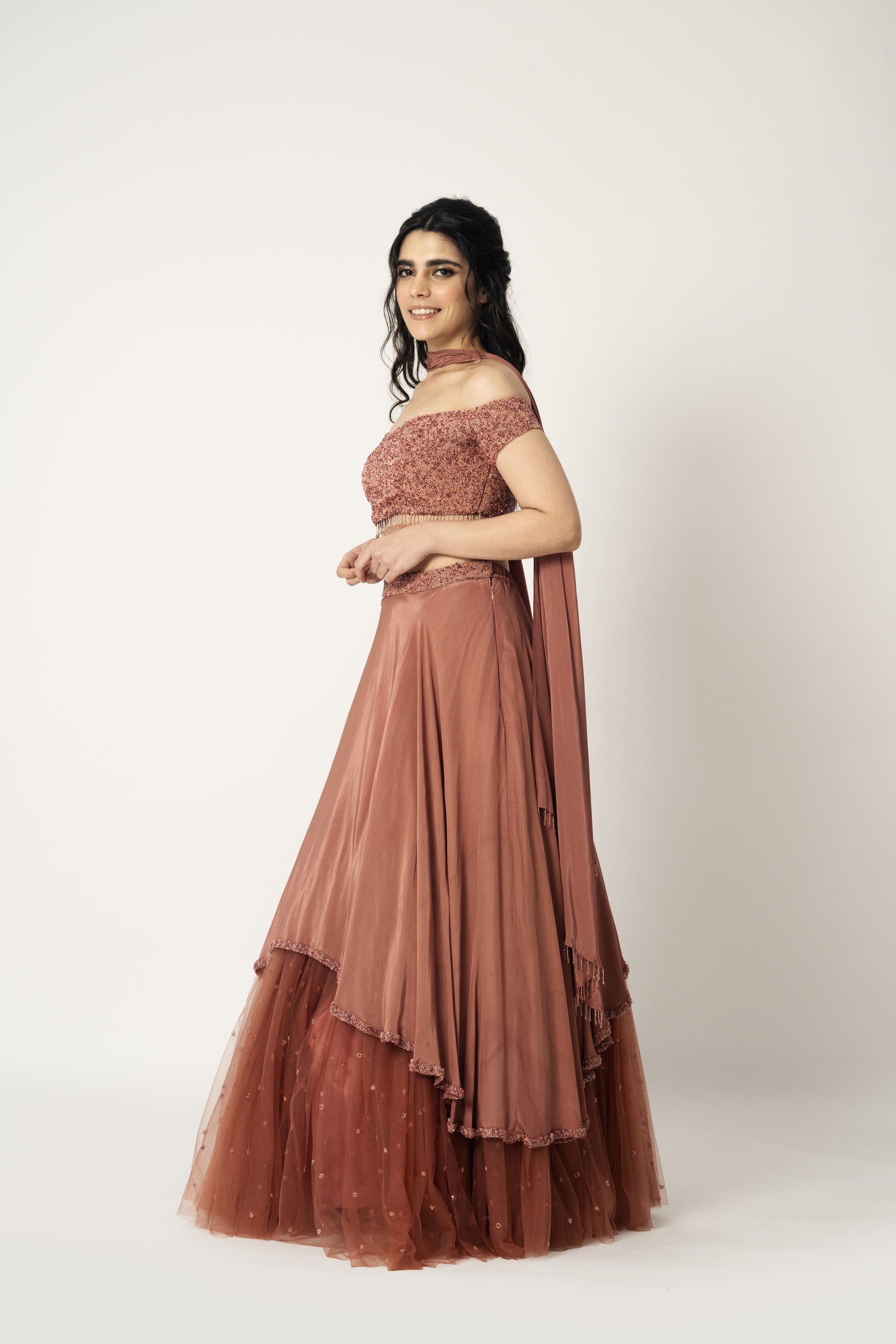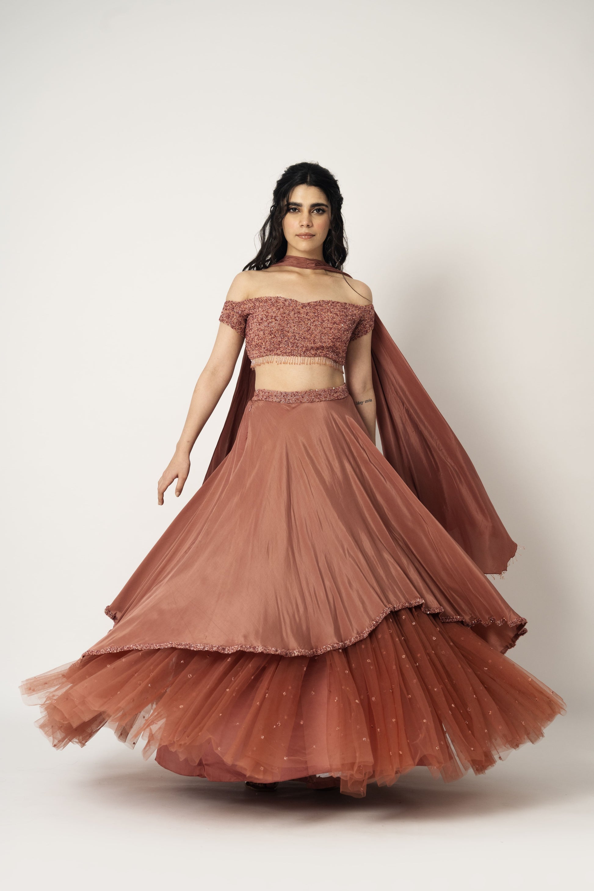 Layered lehenga paired with off shoulder blouse and dupatta