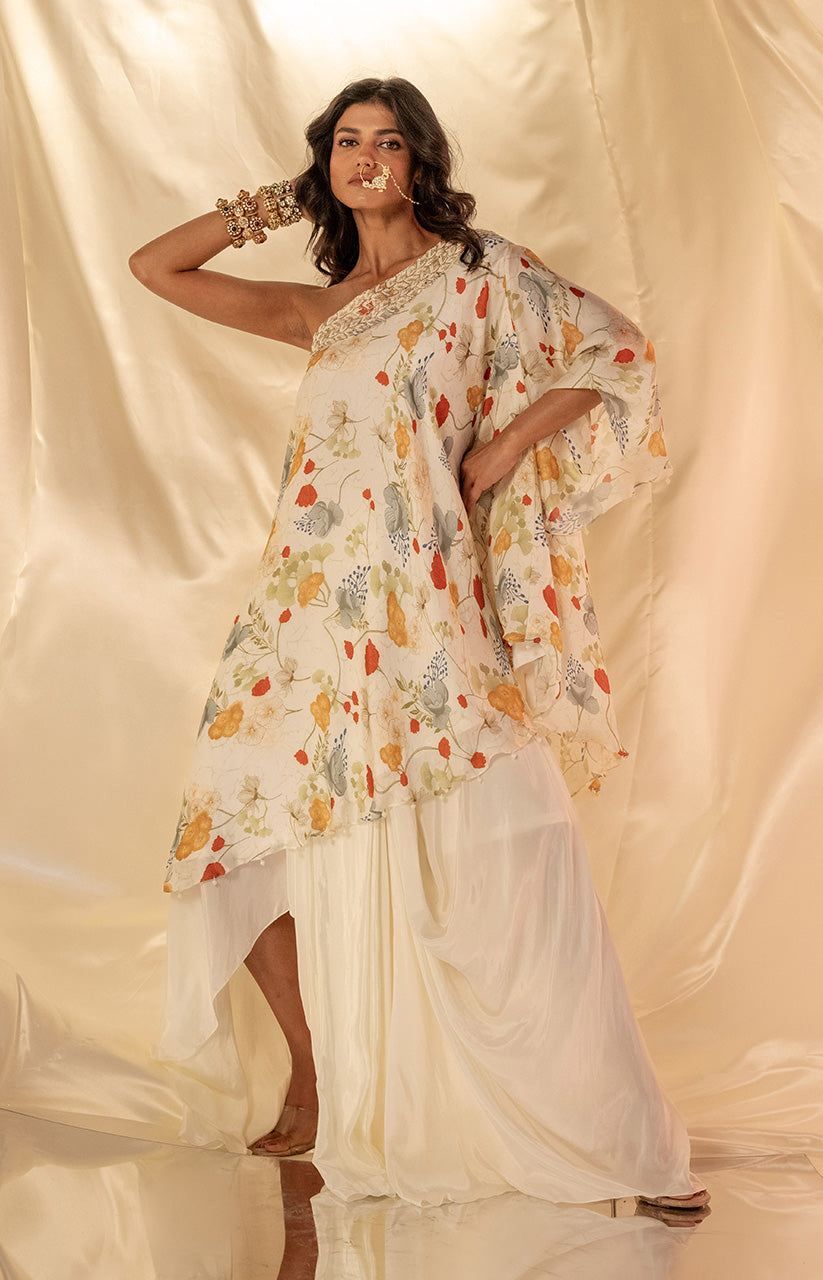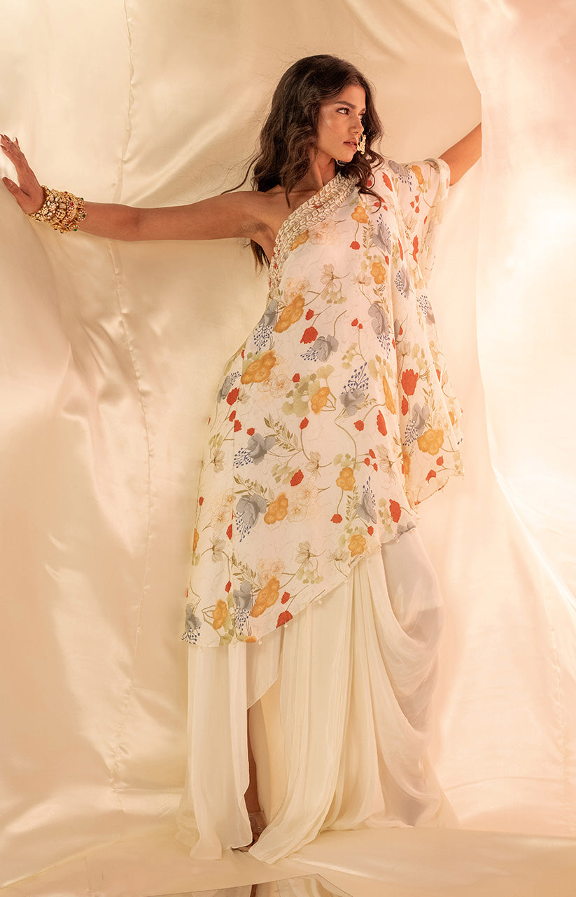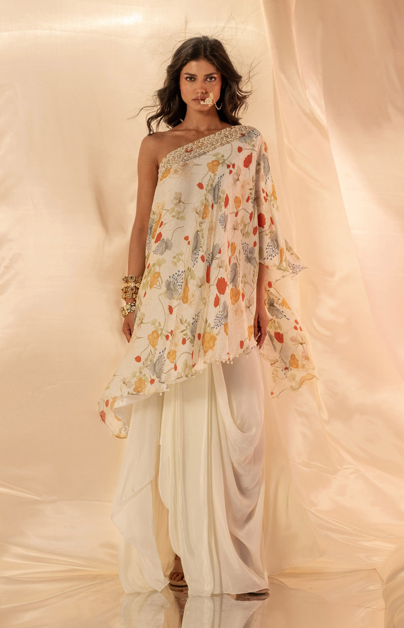 One shoulder embellished top paired with dhoti style drape skirt
