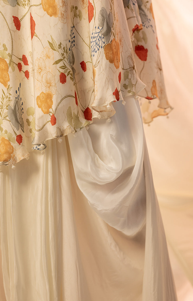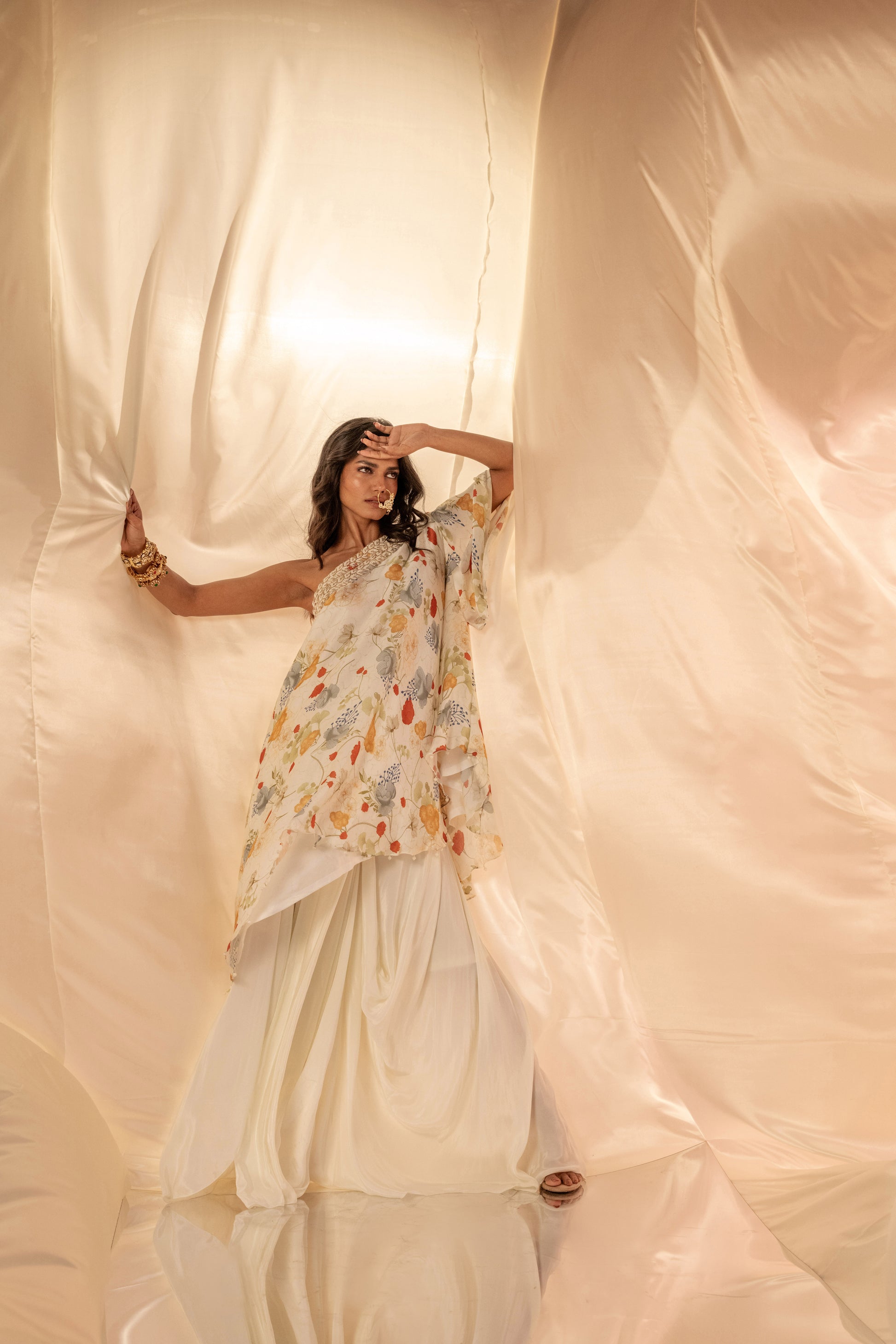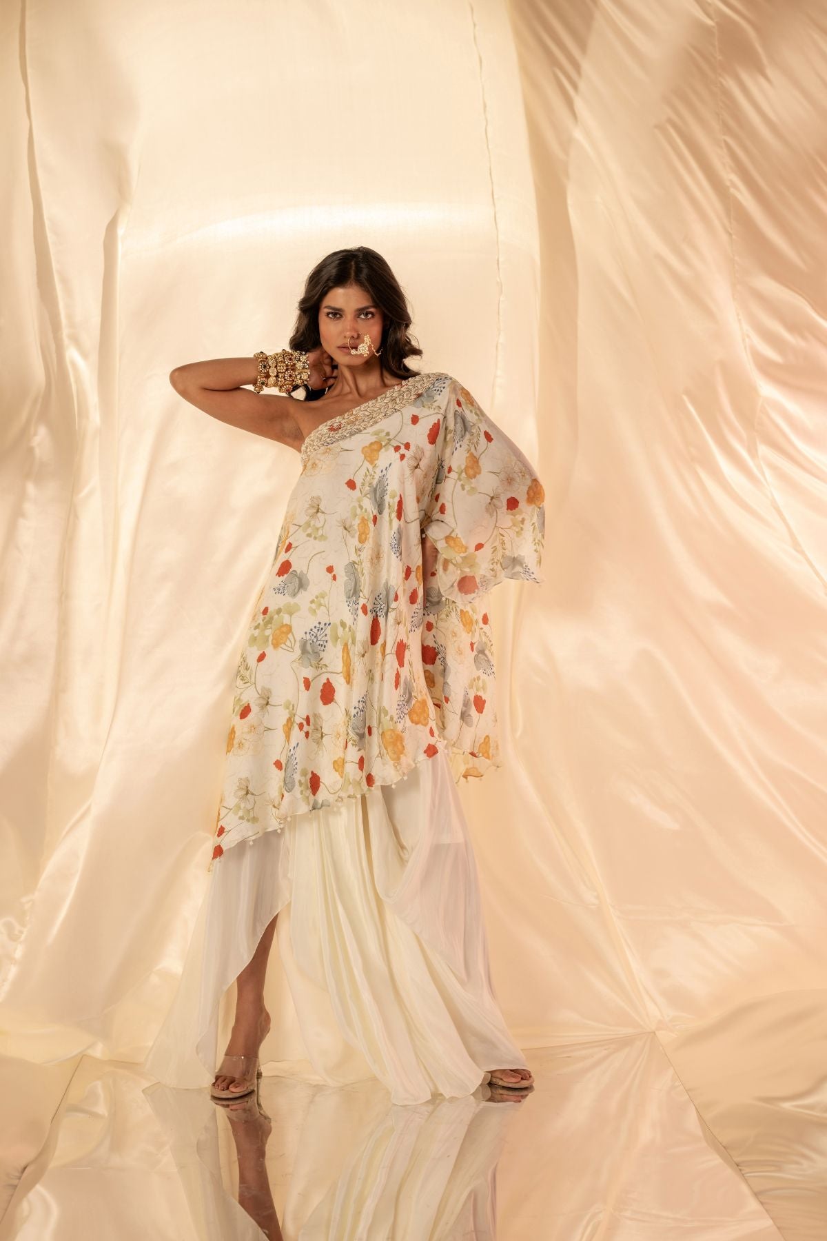 One shoulder embellished top paired with dhoti style drape skirt