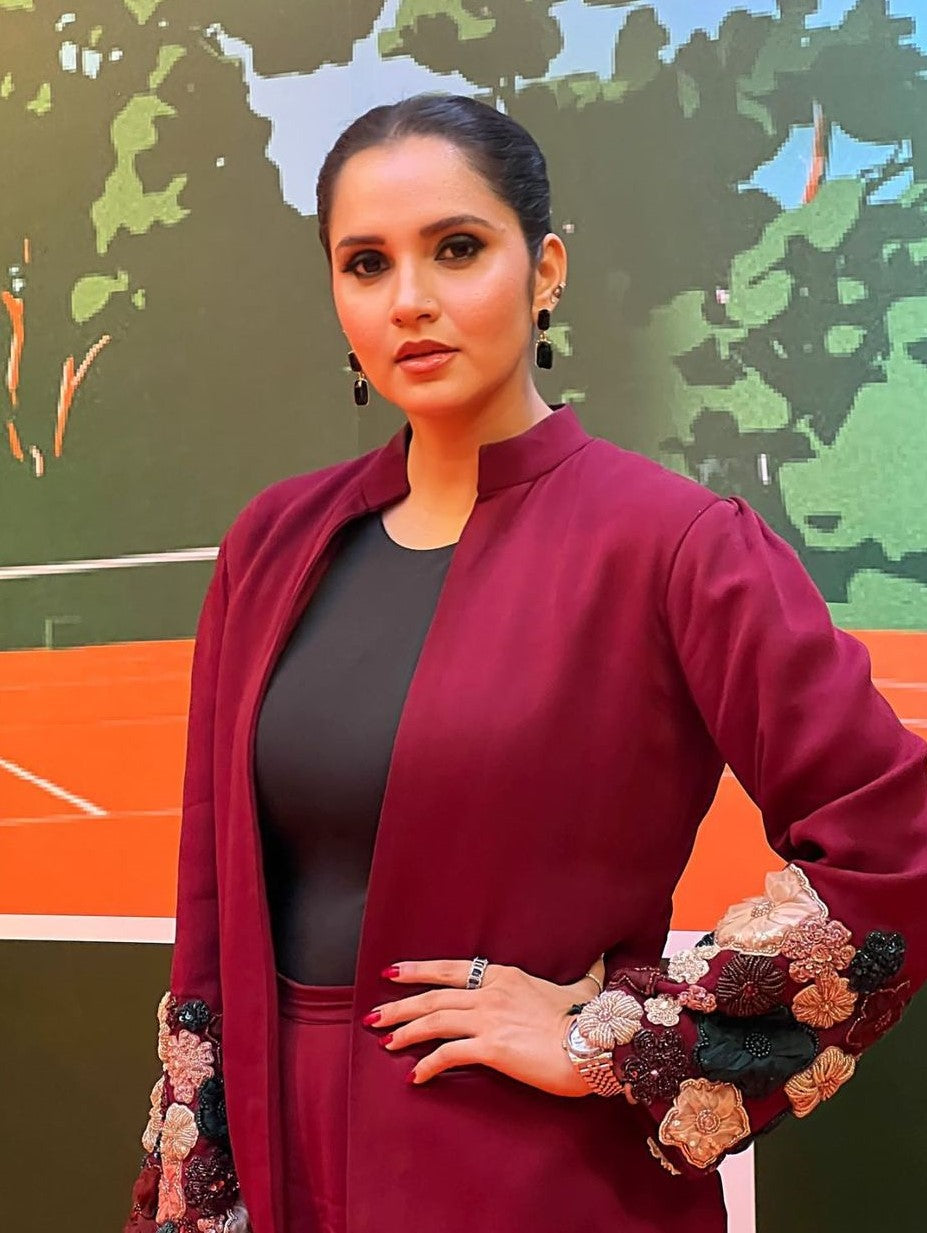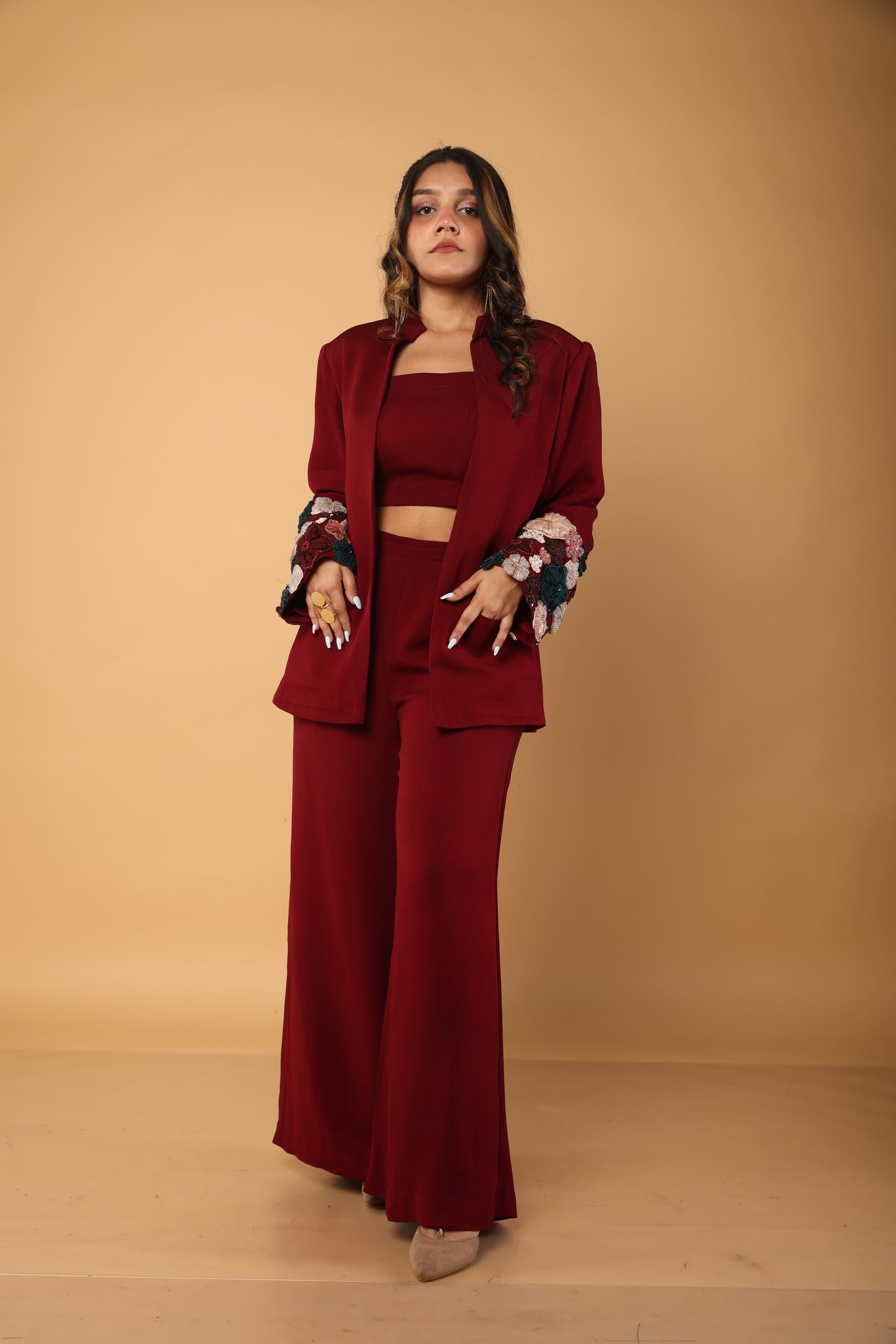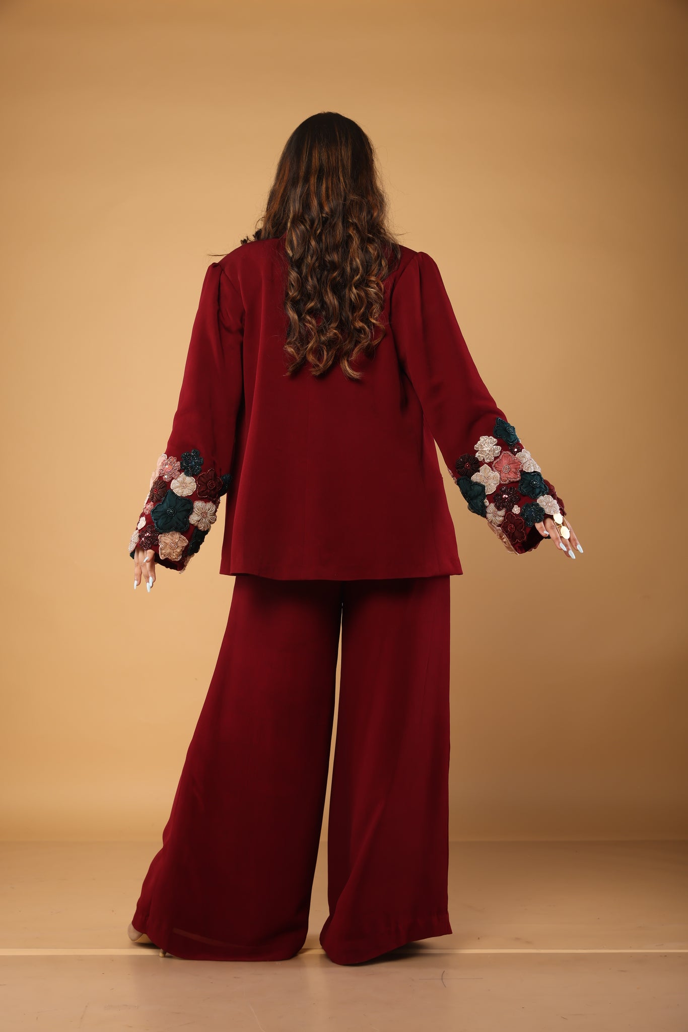 Pant suit with floral embellishments on the sleeves