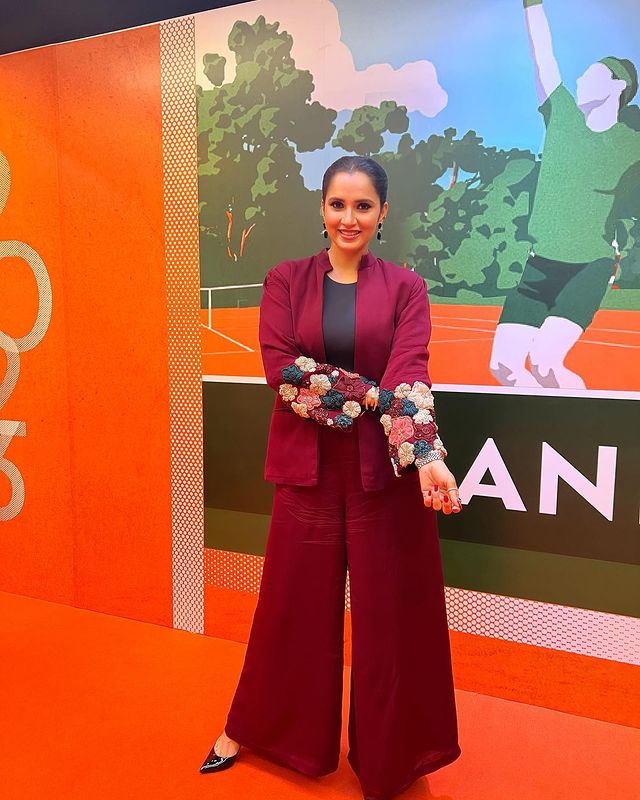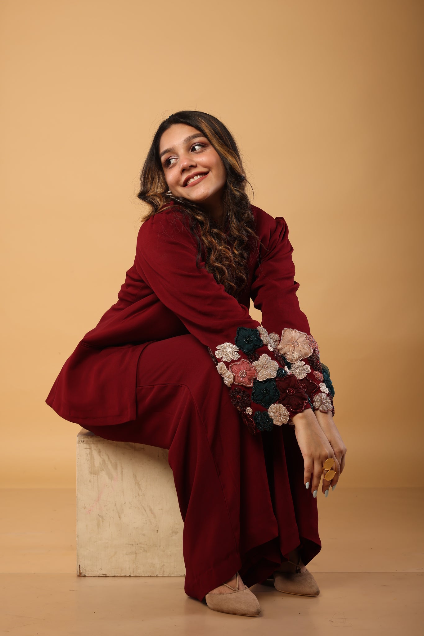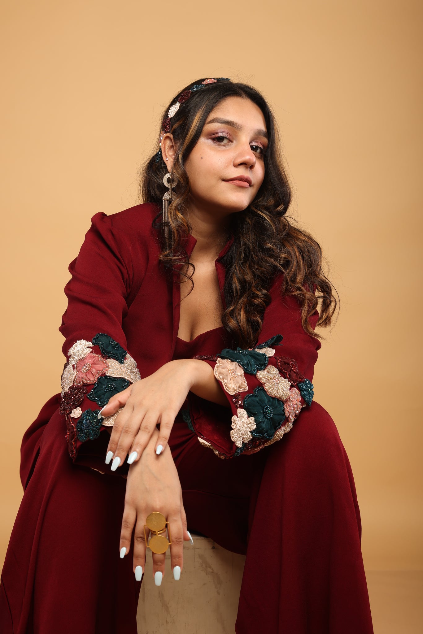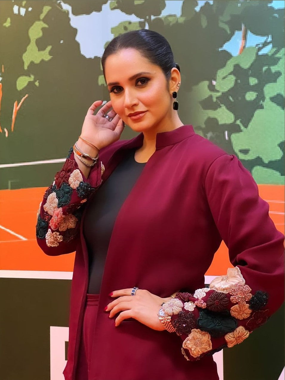 Pant suit with floral embellishments on the sleeves